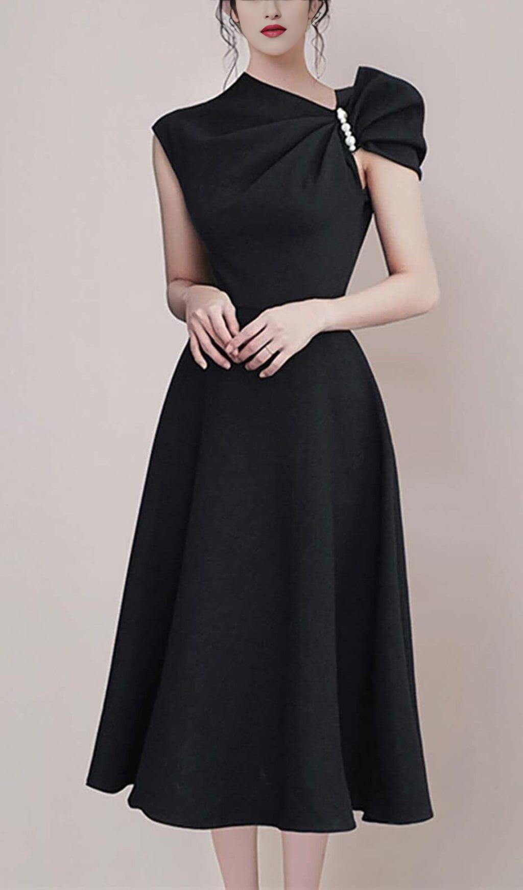 ASYMMETRIC SLEEVE PEARLS MIDI DRESS IN BLACK