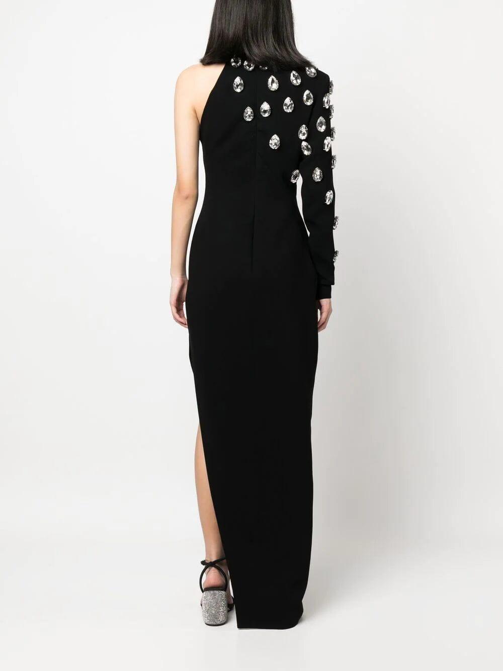 crystal-embellished one-shoulder maxi dress from JEAN-LOUIS SABAJI featuring glass crystal embellishment, high neck, one-shoulder, single long sleeve, maxi and black.