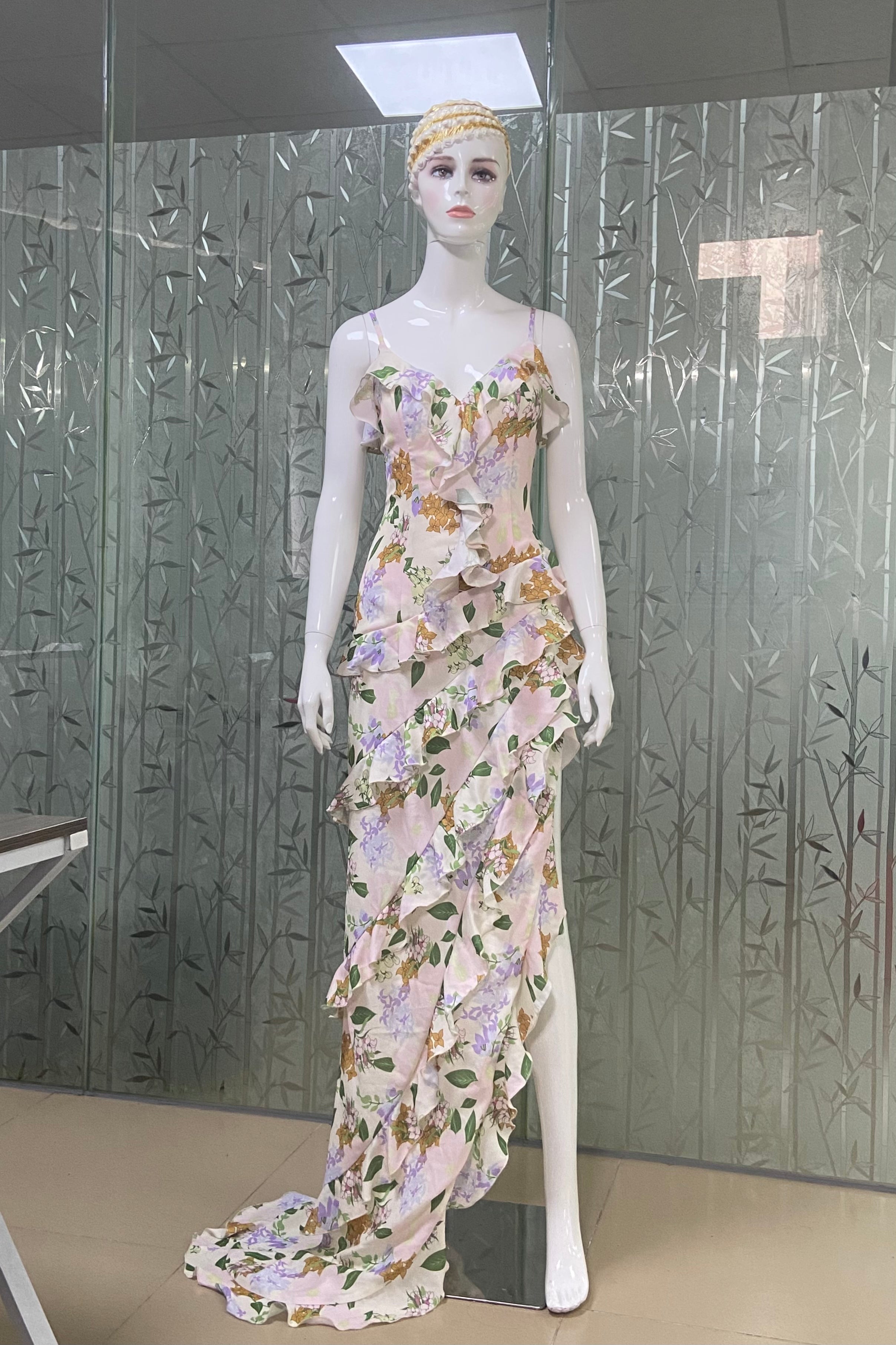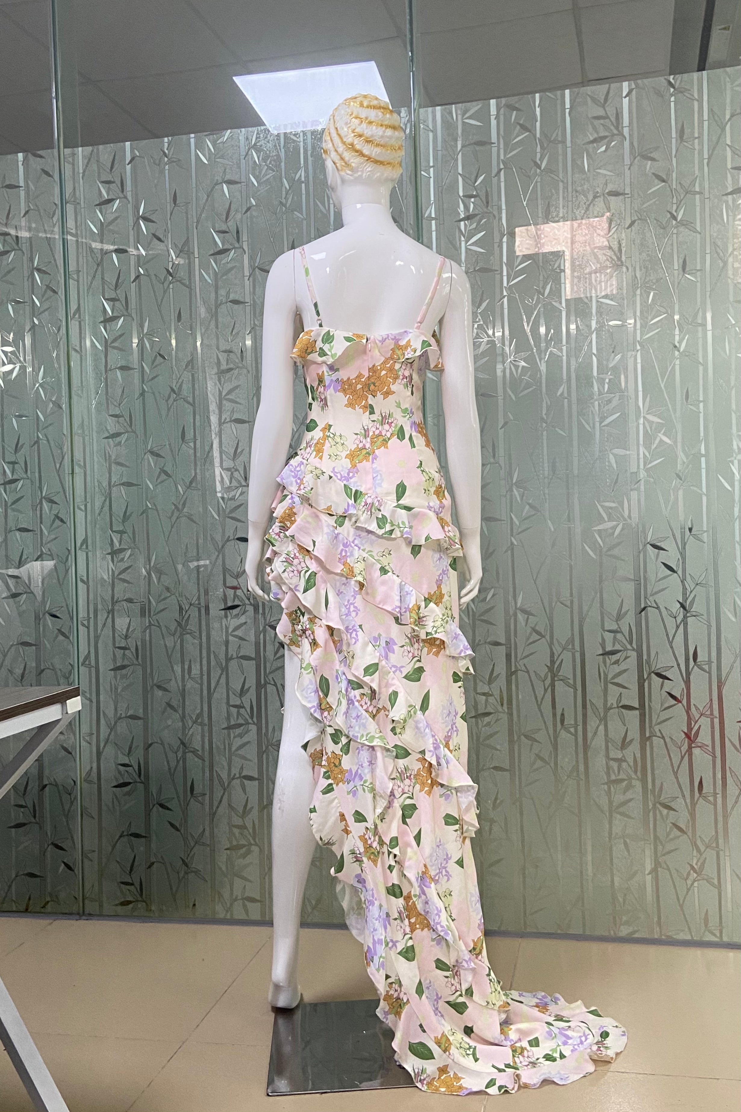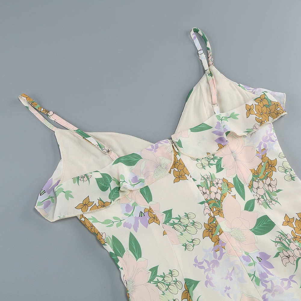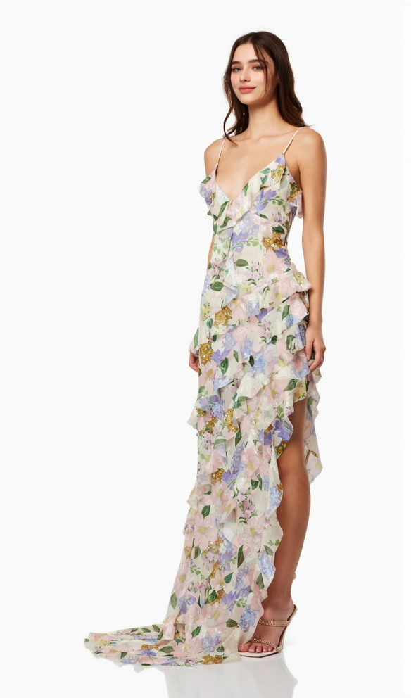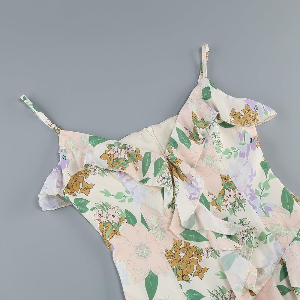 This is a strappy dress. With a light - colored base, it is adorned with fresh green leaves and floral prints, creating a natural and elegant atmosphere. The V - neckline paired with thin straps modifies the neckline and showcases an elegant demeanor. The dress is covered with layers of frills that extend from the neckline to the hem, enriching the visual hierarchy and adding a sense of agility and softness. The overall look is romantic and elegant, highlighting a woman's gentle charm, making it suitable for garden weddings, outdoor parties and other occasions.