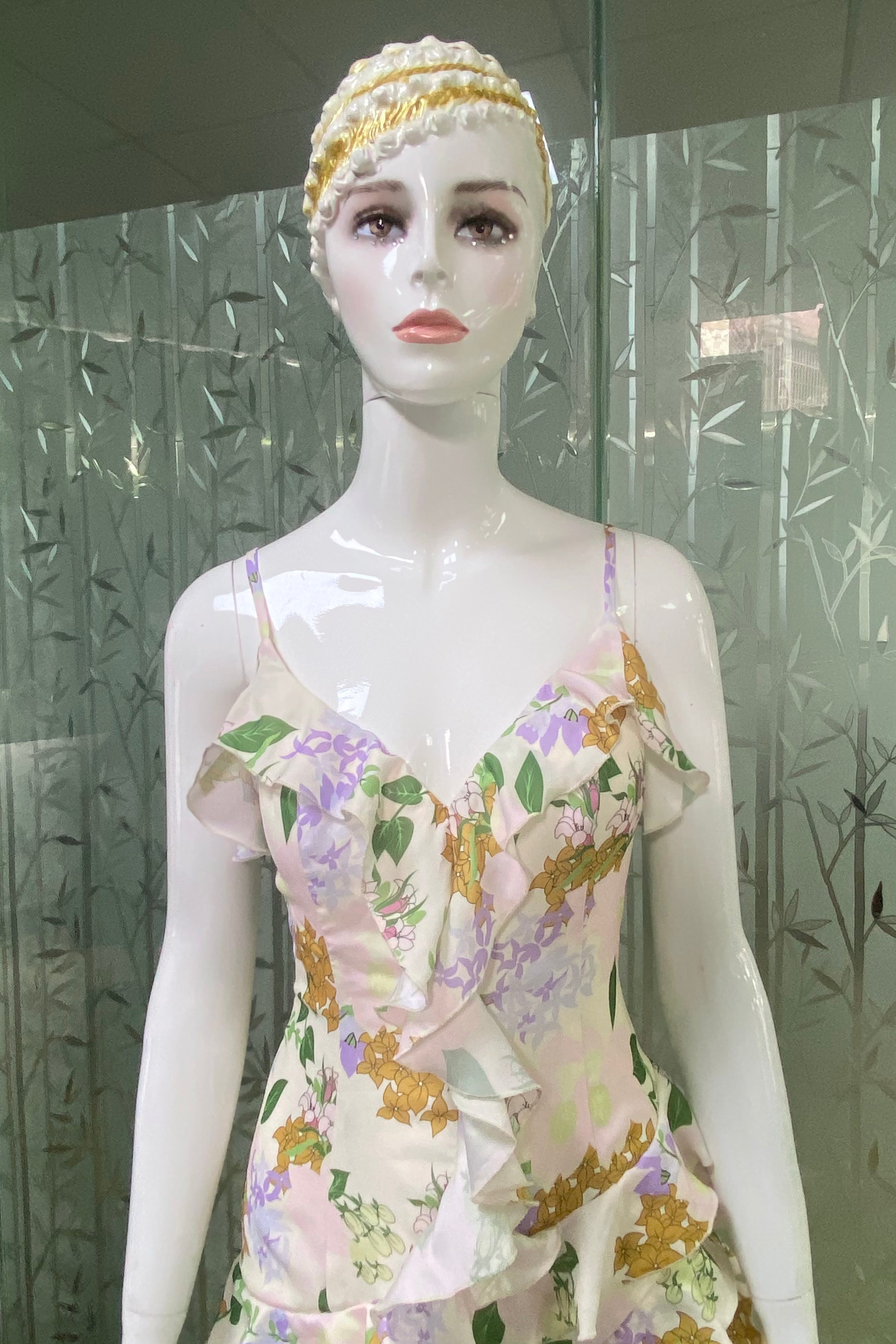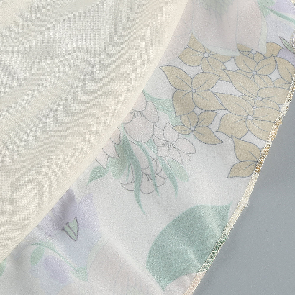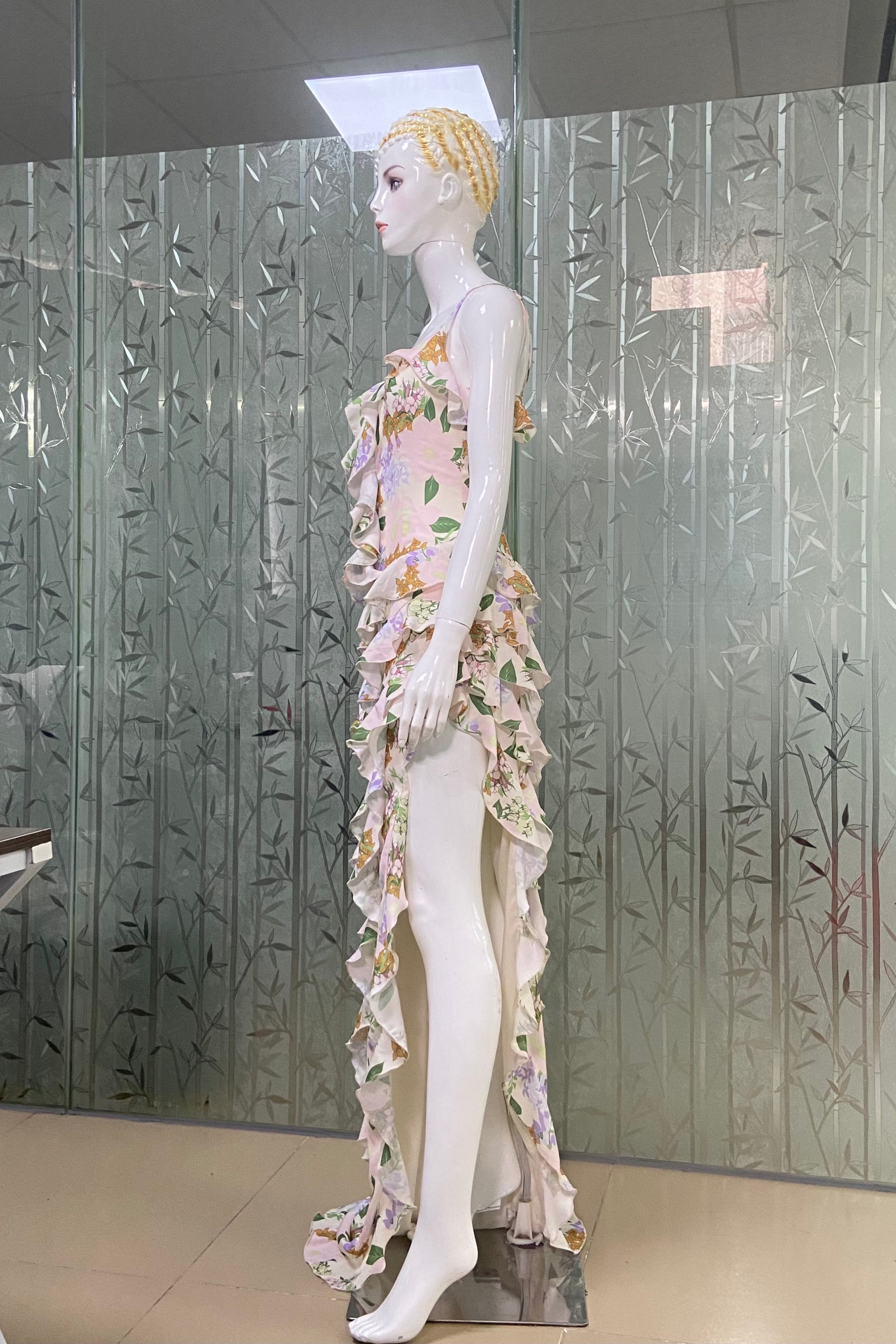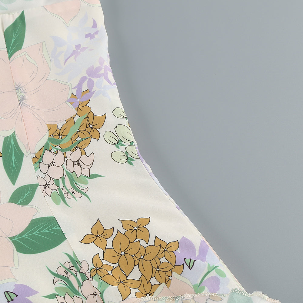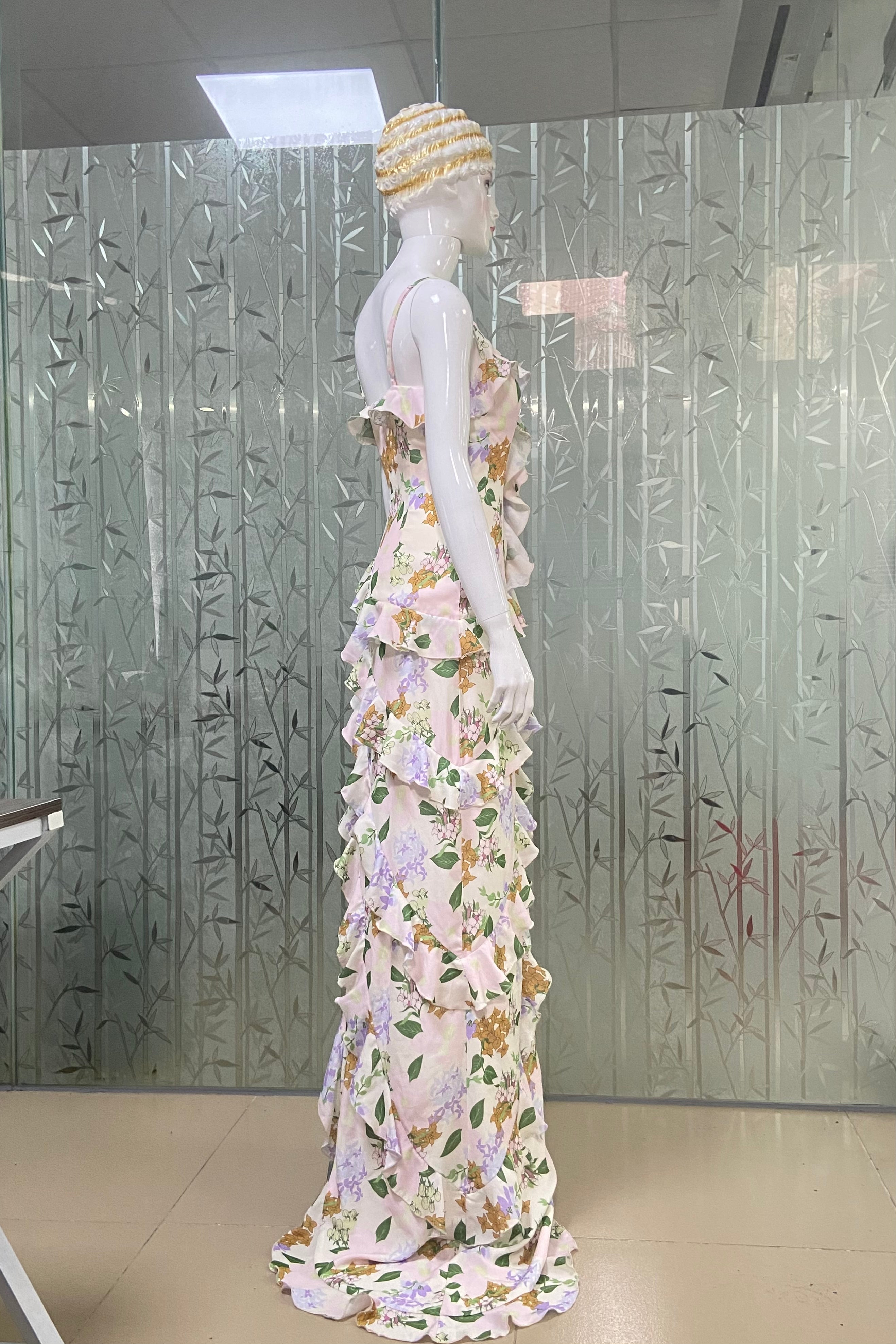This is a strappy dress. With a light - colored base, it is adorned with fresh green leaves and floral prints, creating a natural and elegant atmosphere. The V - neckline paired with thin straps modifies the neckline and showcases an elegant demeanor. The dress is covered with layers of frills that extend from the neckline to the hem, enriching the visual hierarchy and adding a sense of agility and softness. The overall look is romantic and elegant, highlighting a woman's gentle charm, making it suitable for garden weddings, outdoor parties and other occasions.