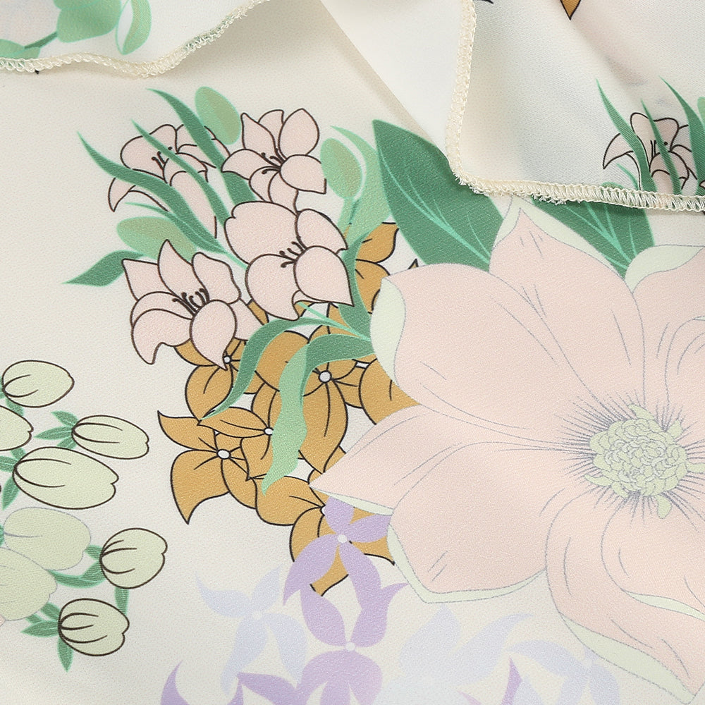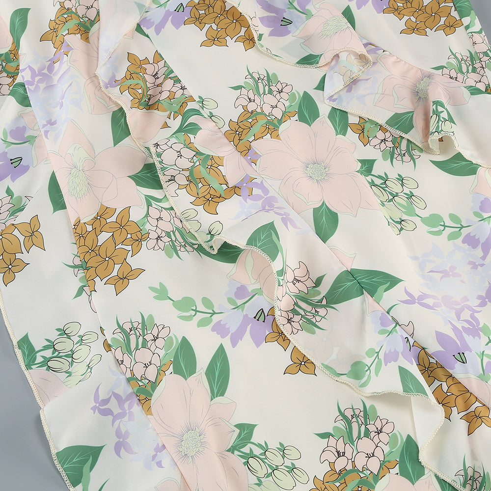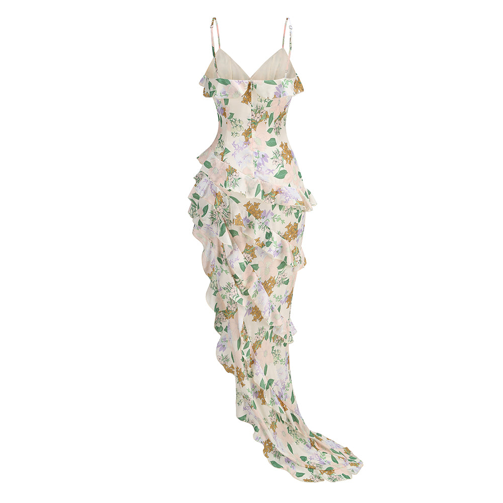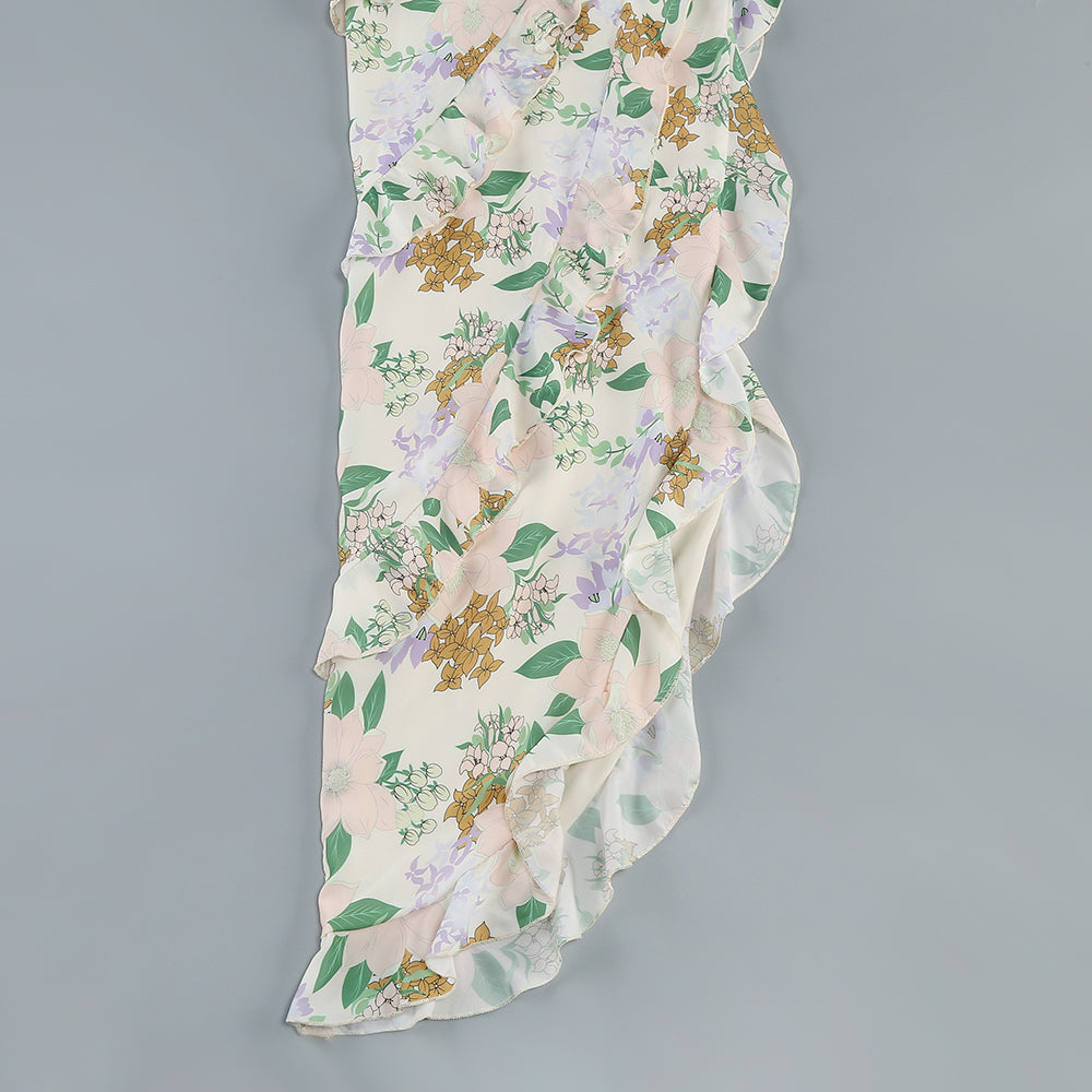 Asymmetrical Ruffled Floral Draped Maxi Dress in Beige