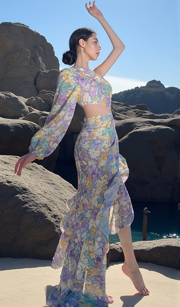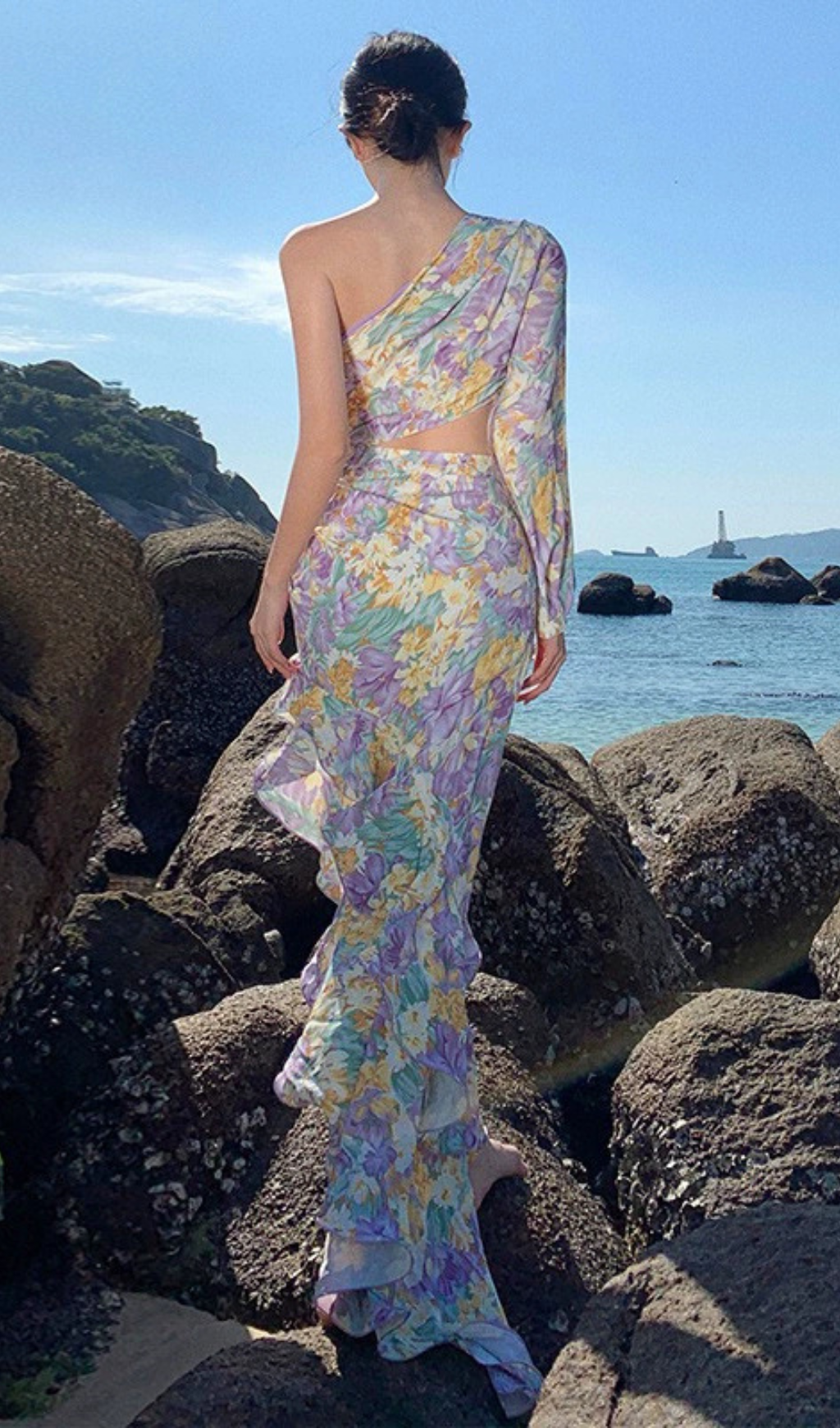 ASYMMETRICAL RUFFLED ONE SLEEVE MIDI DRESS