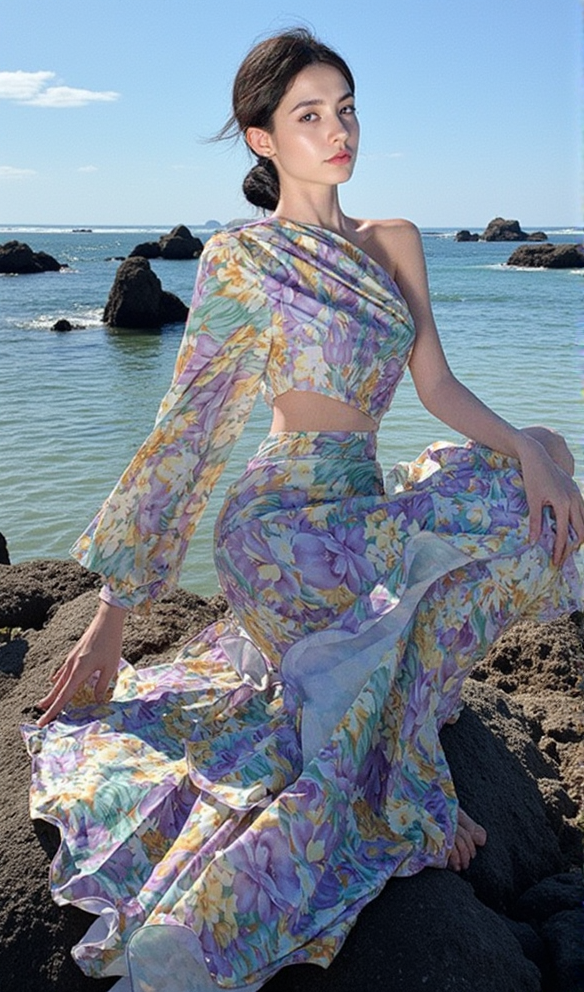 Featuring a unique one-sleeve design and elegant ruffled details, this dress will make you stand out in any occasion. The asymmetrical length adds a touch of modernity and sophistication. Elevate your wardrobe with this must-have dress!