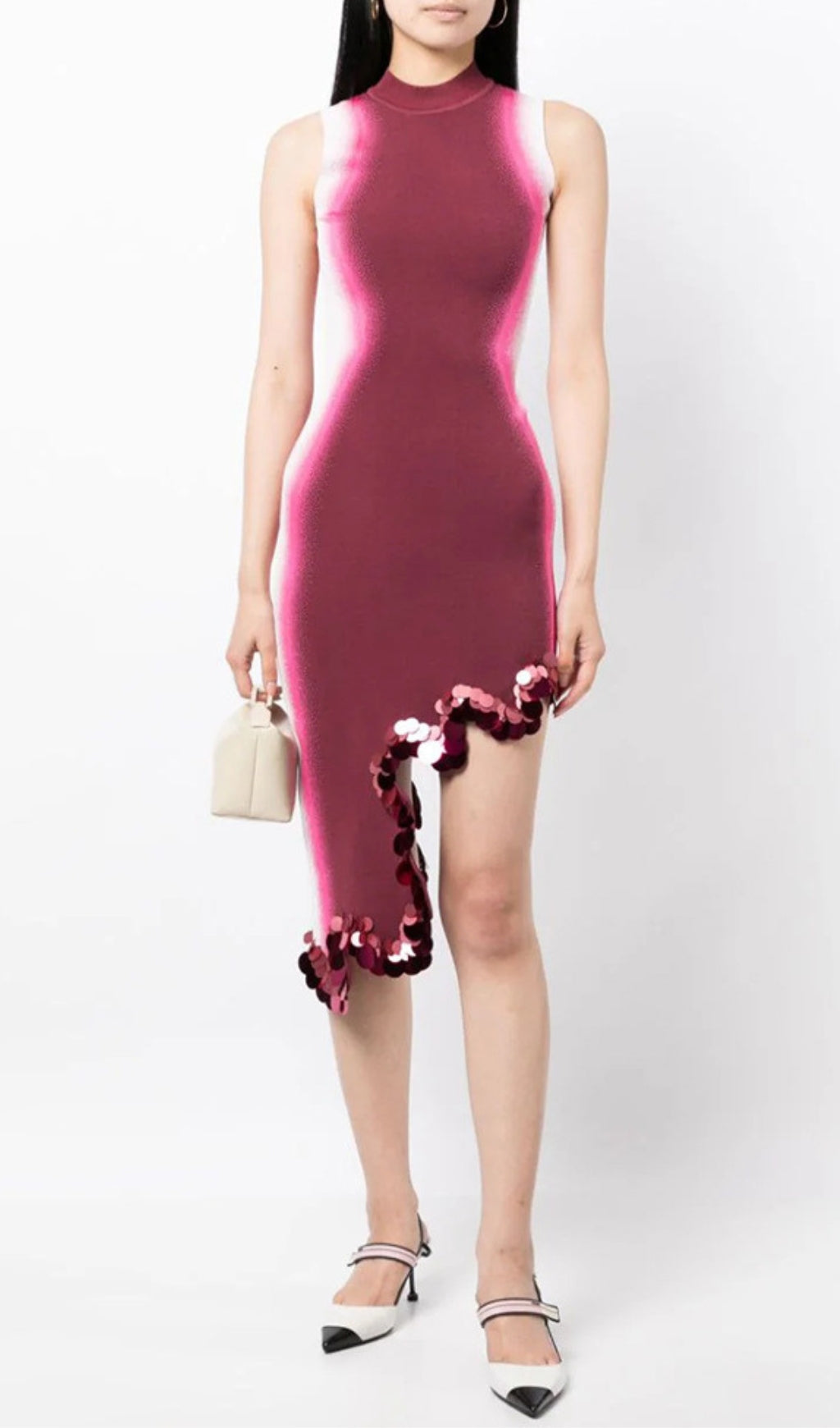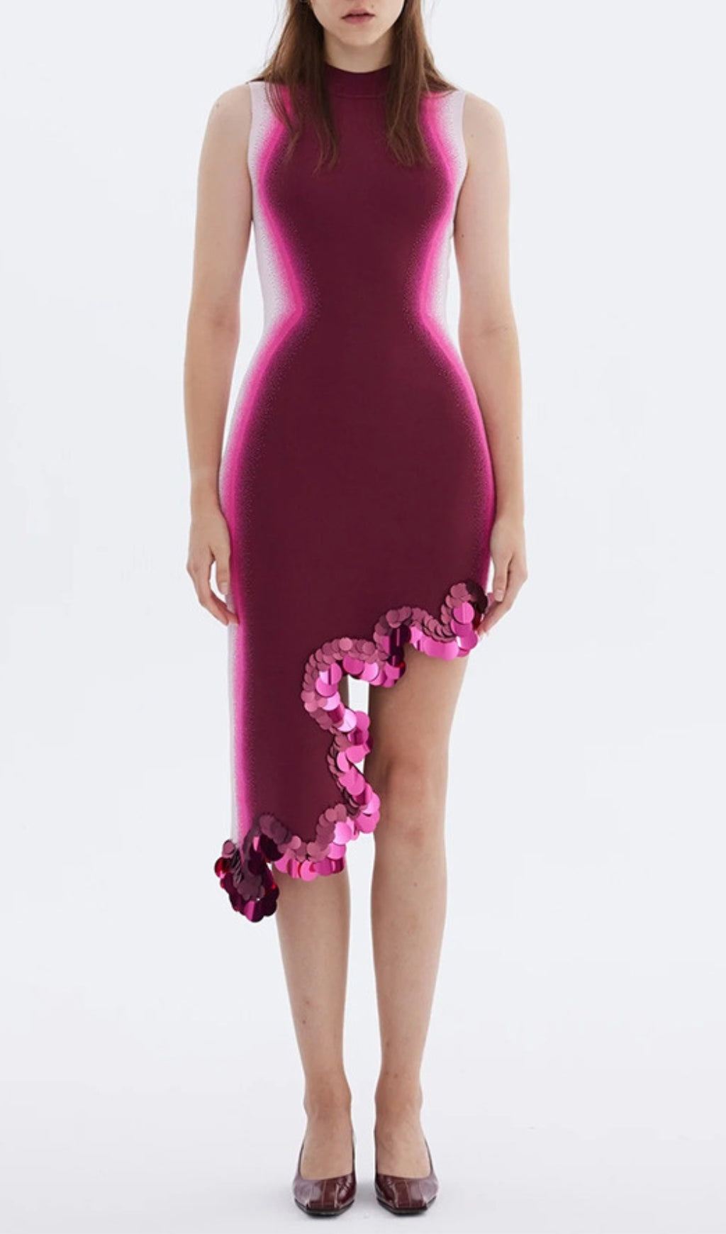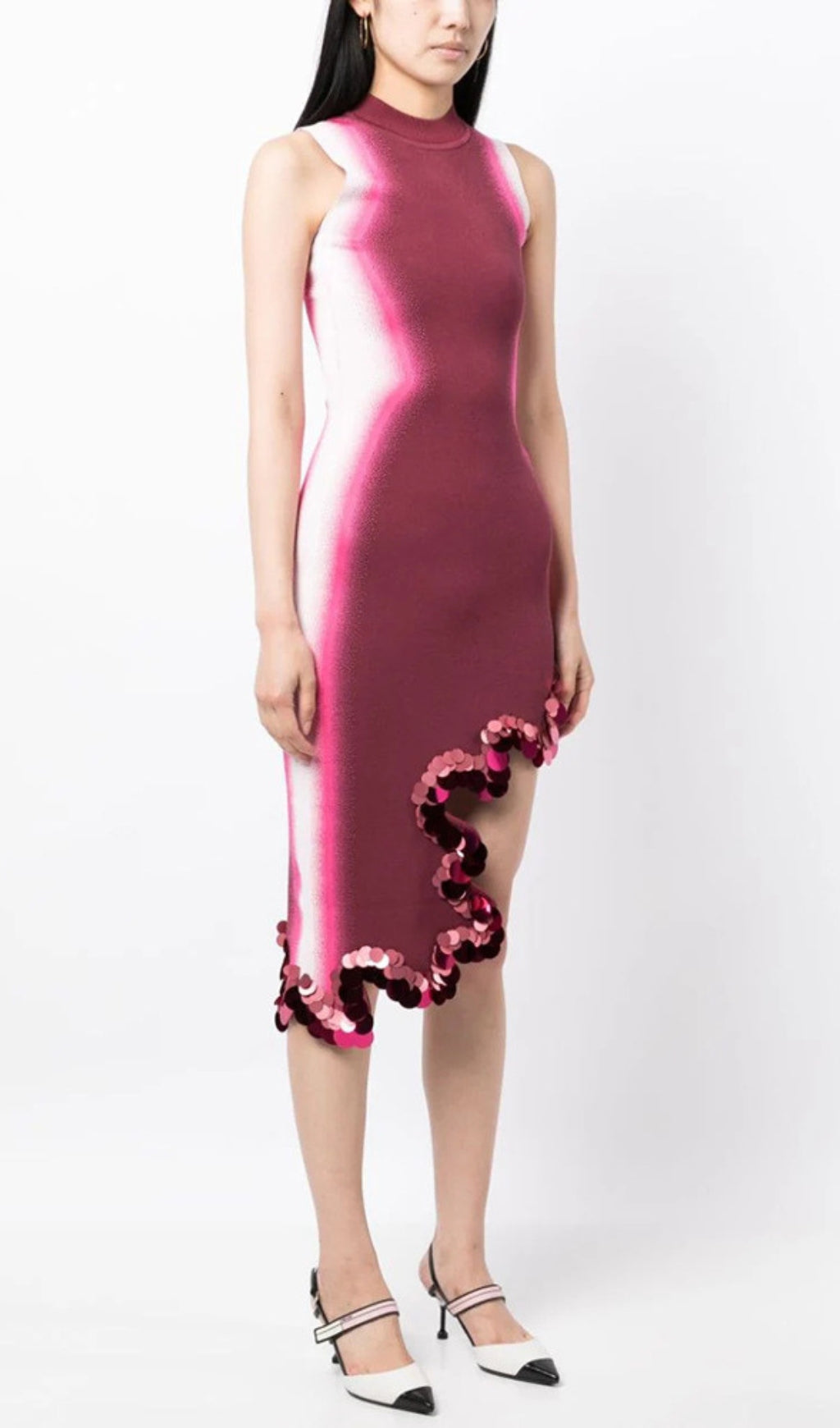 Signature wavy asymmetric dress in sustainably sourced yarns and recycled sequins. Side border details create a slimming optical illusion, while the statement print and wavy hem steal the show.