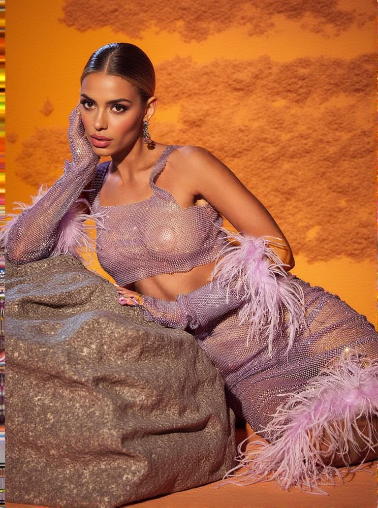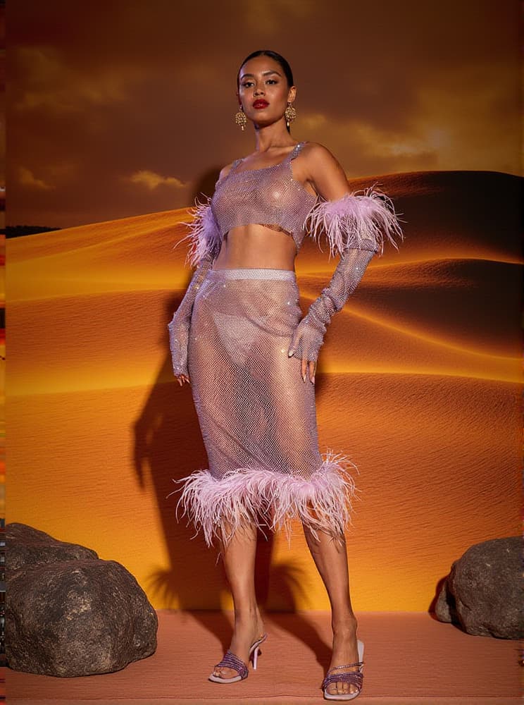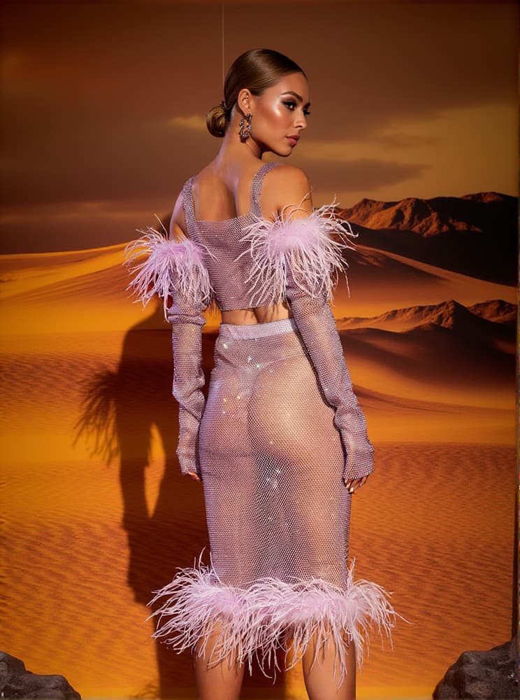 Achieve a luxe look in the Avery Mesh Diamond Feather Trimmed Skirt Set. This two-piece set features a mesh diamond-studded midi skirt and sleeves, detailed with delicate feather trims. Perfect for evening events, you'll turn heads with this eye-catching ensemble.