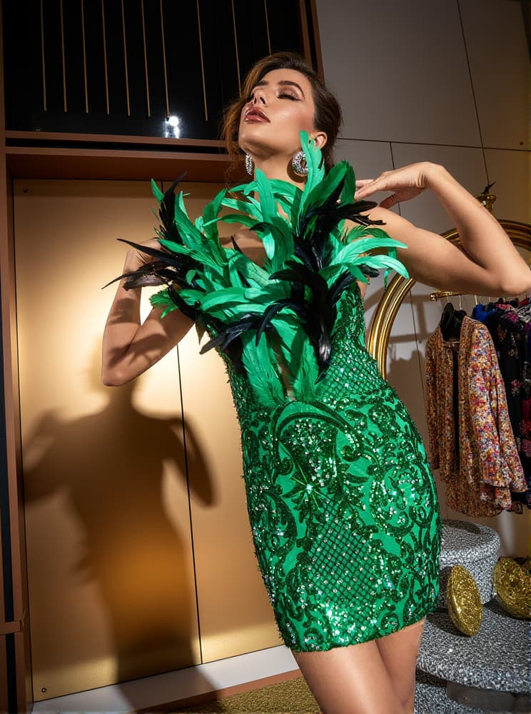Introducing the Aydin Strapless Sequin Feather Mini Dress; a stylish and eye-catching addition to any wardrobe. Crafted from a combination of lightweight sequin and feather, this dress is perfect for any occasion and is sure to turn heads. Its lightweight design ensures maximum comfort and breathability while ready to guarantee a confident appearance. Experience fashion in a whole new way with the Aydin Strapless Sequin Feather Mini Dress.
