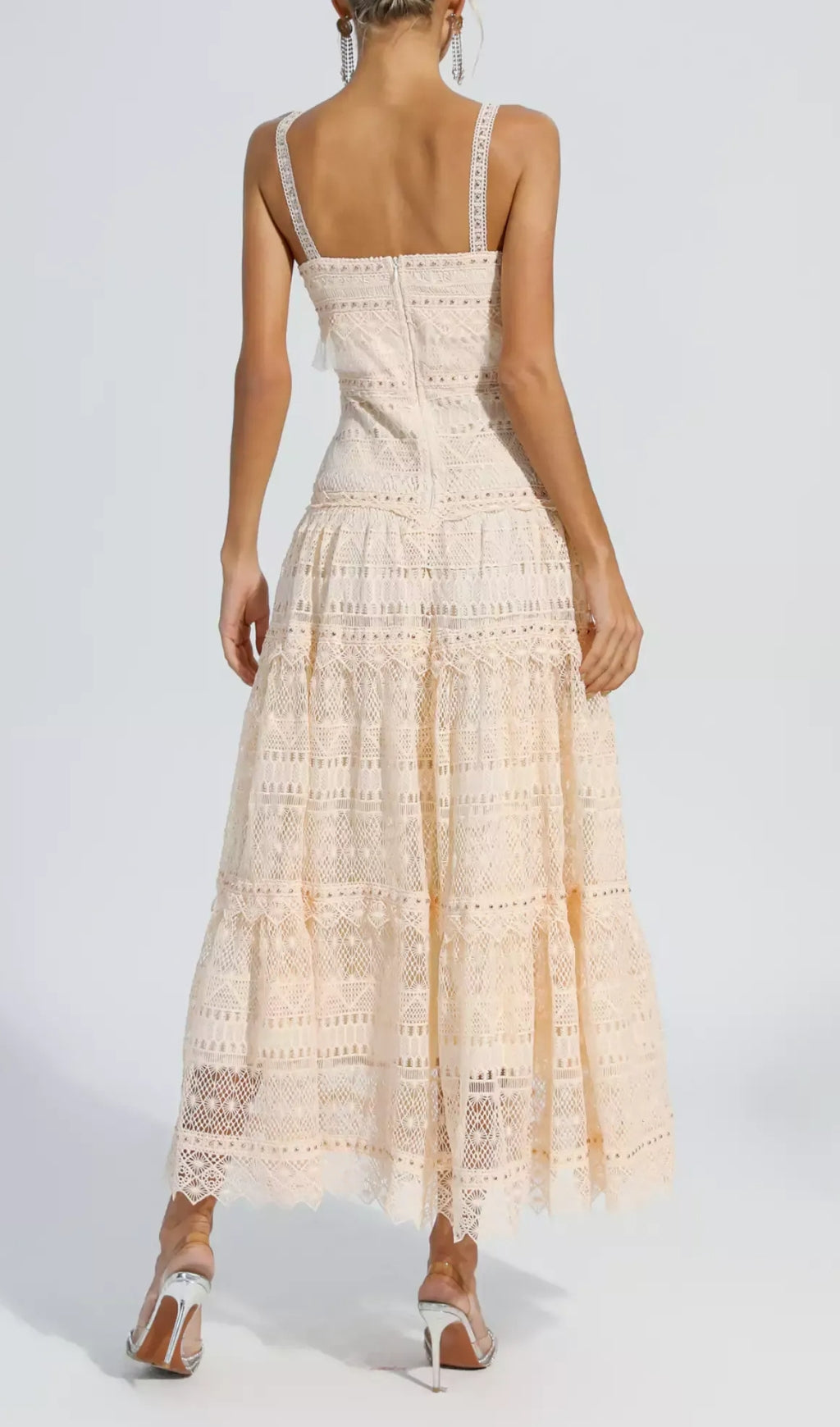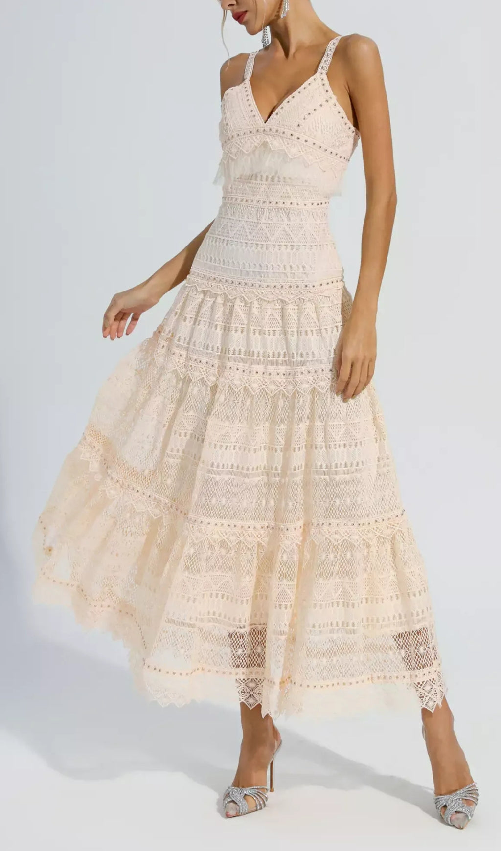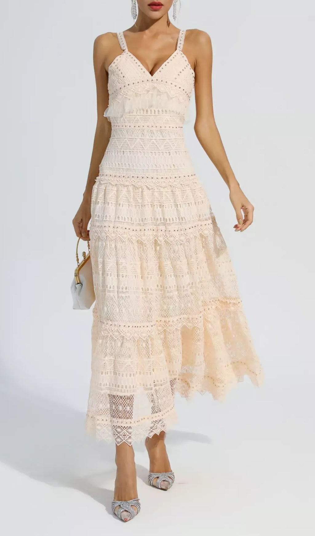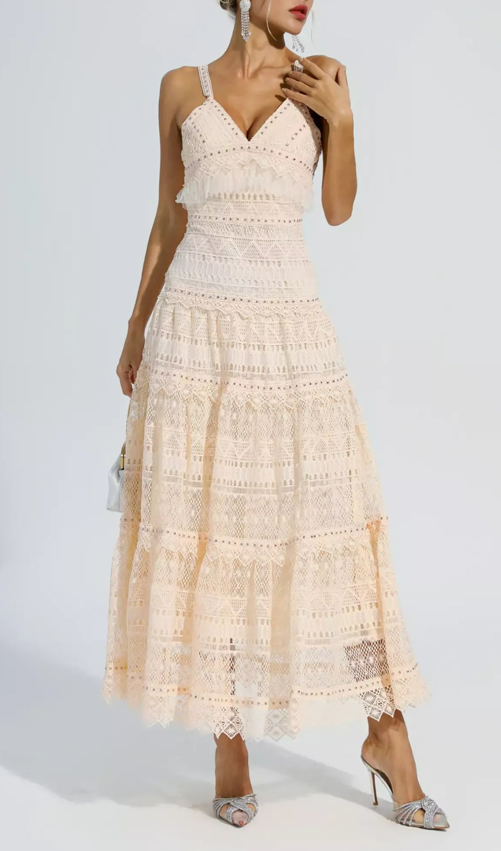 AZURE APRICOT V-NECK LACE MAXI DRESS