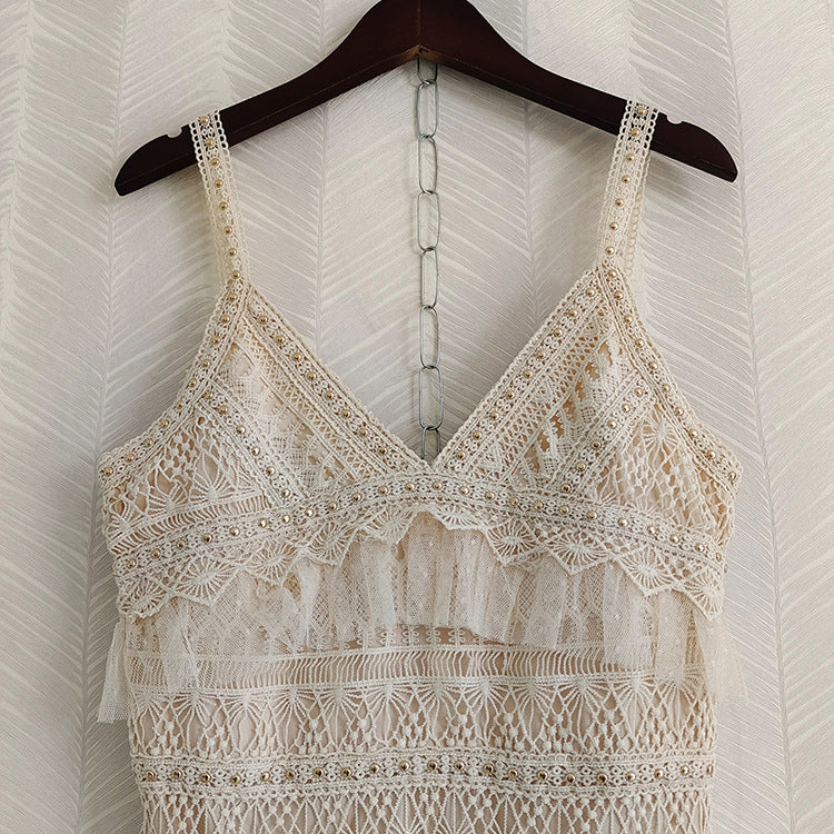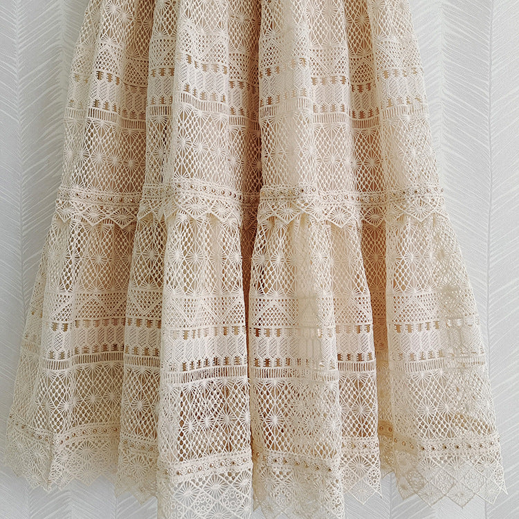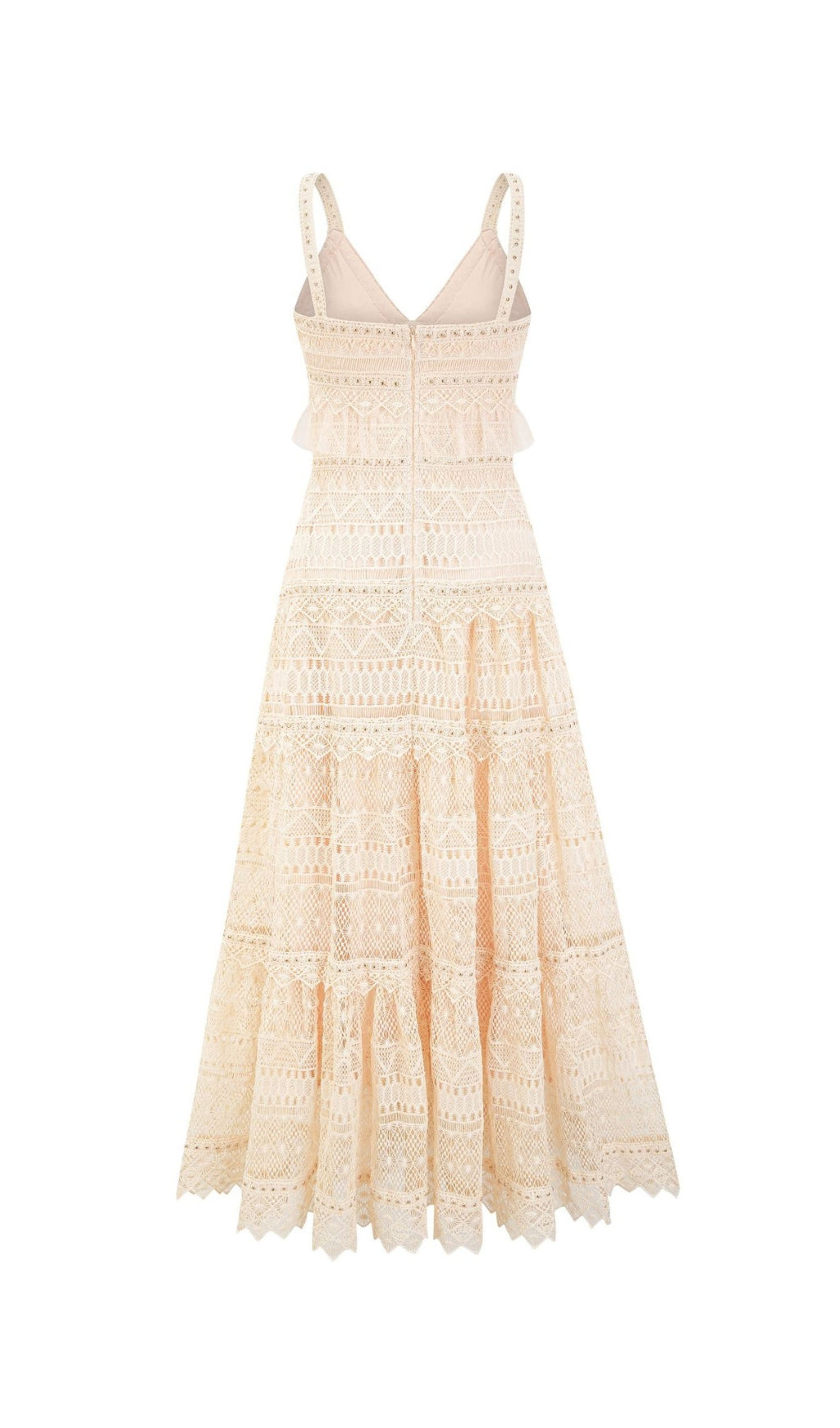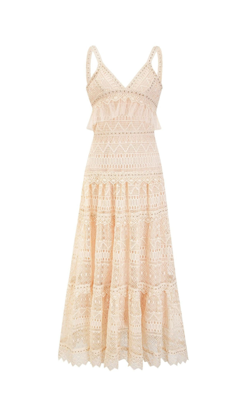 Azure Apricot V-neck Lace Maxi Dress, which is lightweight, soft and comfortable. The V-neck design shows off your elegant collarbone, allowing you to enjoy fashion while exuding charming charm. The skirt has a high waist to elongate your proportions. This dress is perfect for a seaside holiday but also suitable for everyday wear.