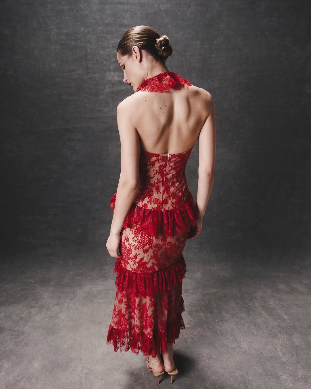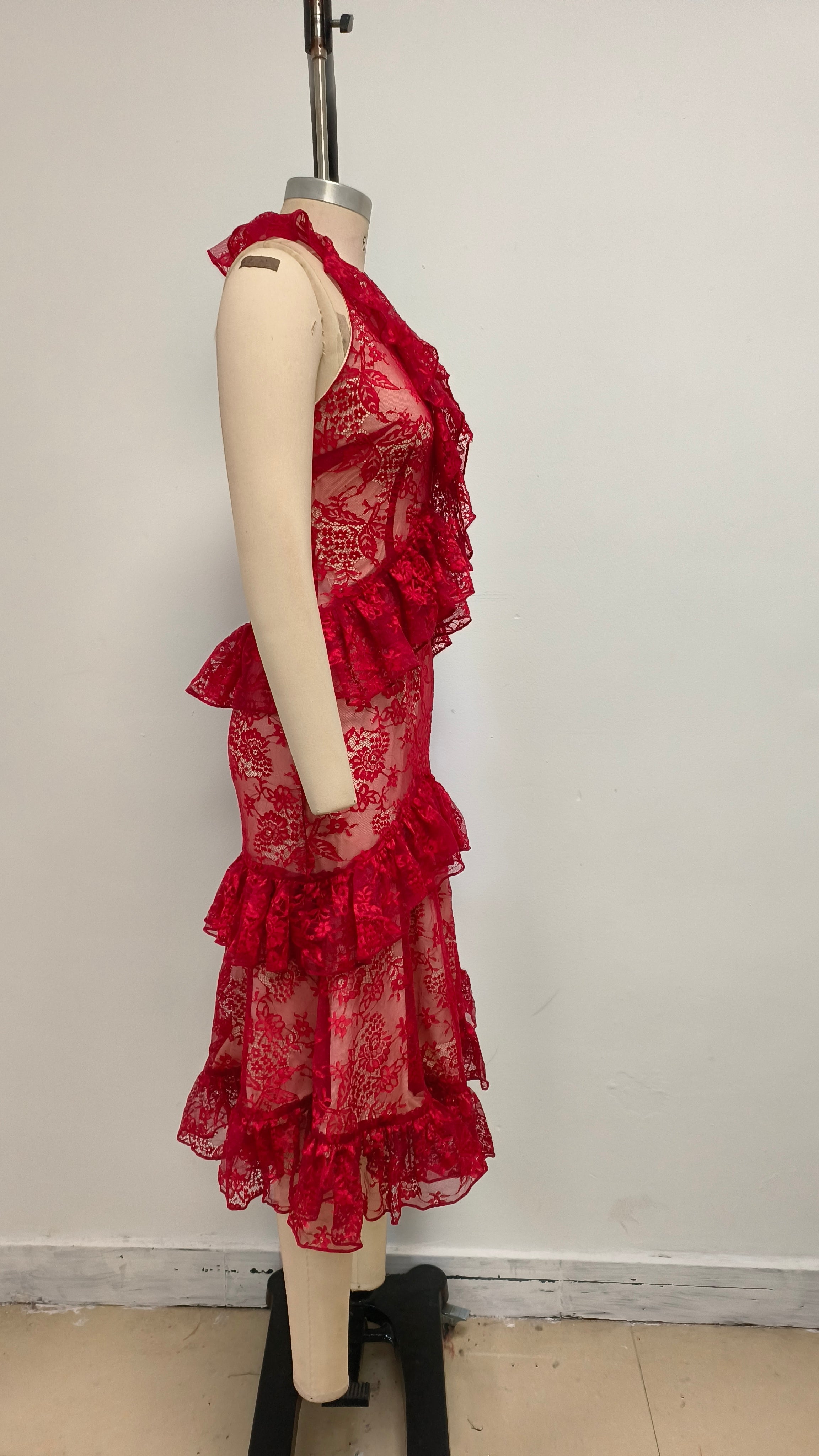 Backless lace ruffled halter neck red midi dress