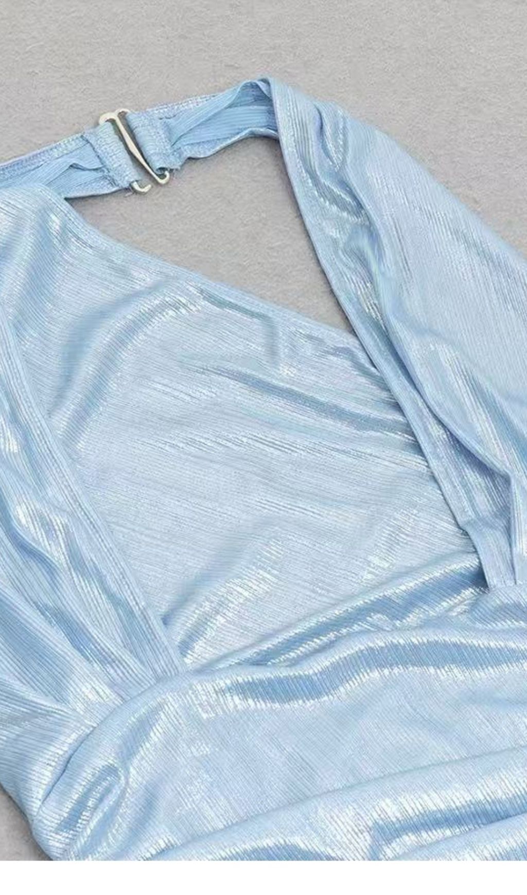 The sleek design and halter neckline accentuate your figure, while the eye-catching metallic fabric adds a touch of glam. Perfect for any formal event, this dress will make you stand out with its elegant and modern style.