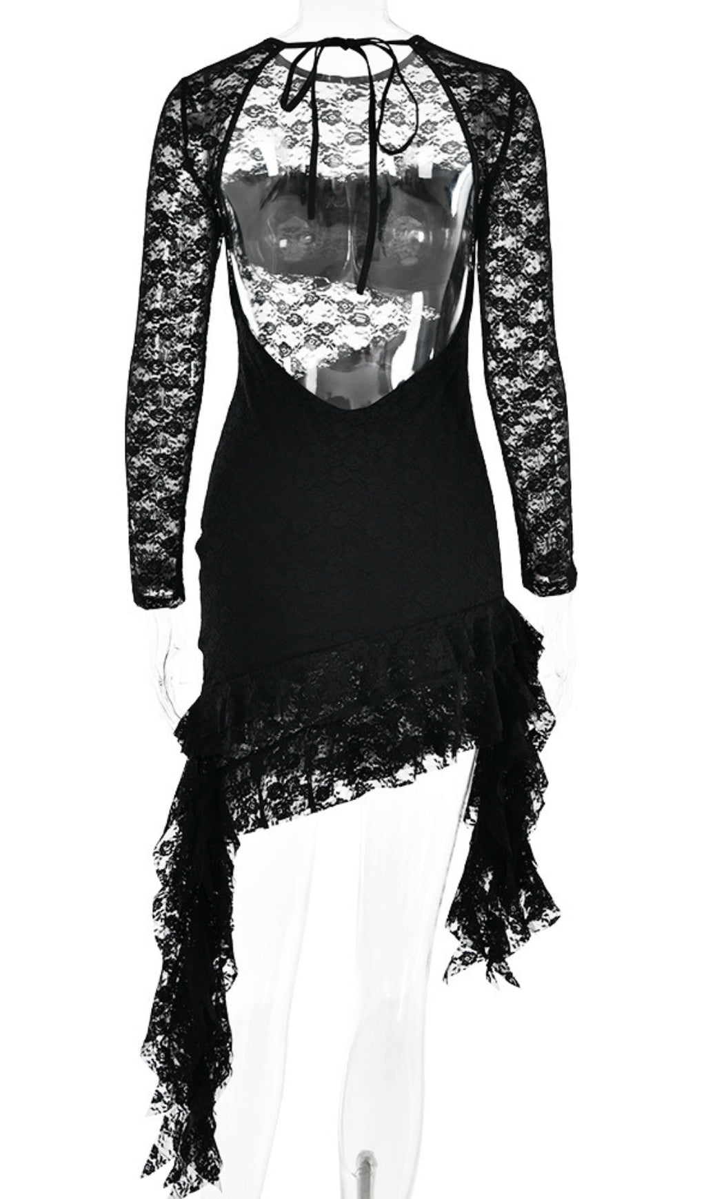 • Round Collar, Long Sleeves, Backlless, Back Cut-out Design, Bias Cut, Ruffle Hem,