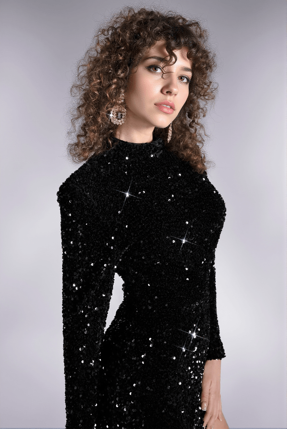She is a style icon, known for her impeccable taste in fashion. She perfectly showcases how the Balea Long Sleeve High Slit Sequin Dress can transform your evening wear into an unforgettable statement.