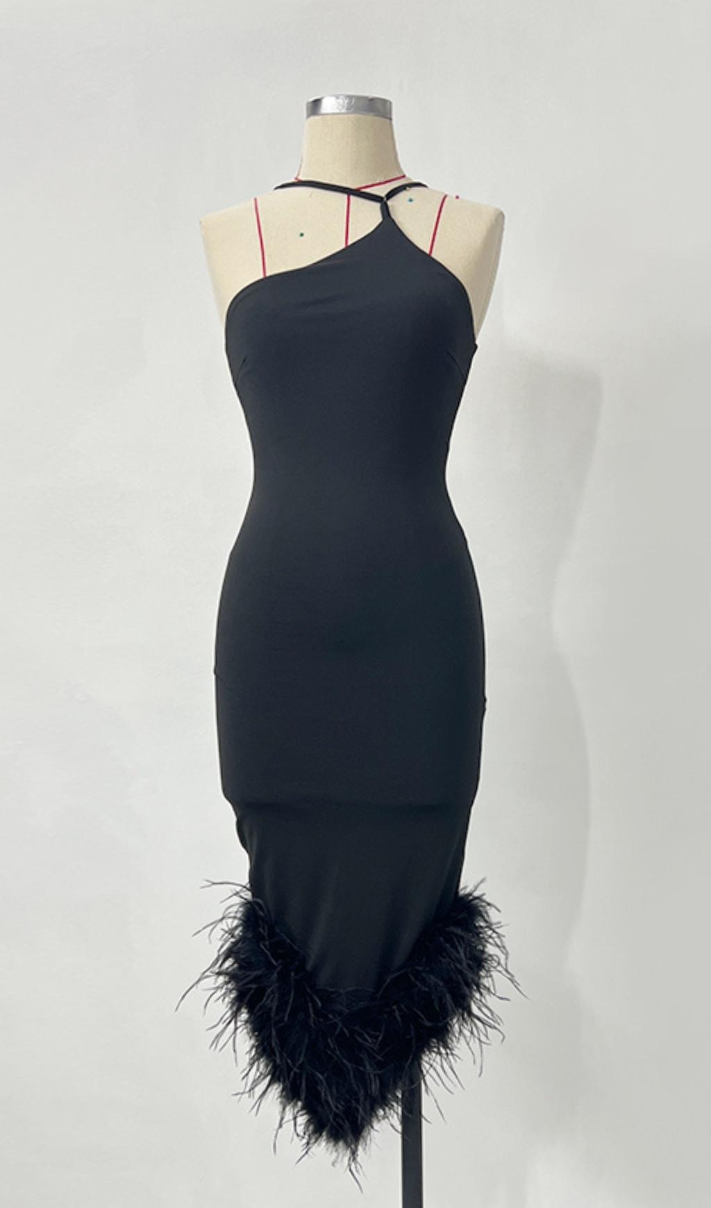 This dress is beautifully designed for summer and has a romantic vacation vibe. The cross-over shoulder design is very elegant, the tight design is perfect to show off your curves, and your charm. The feathers at the end of the dress are the finishing touch.