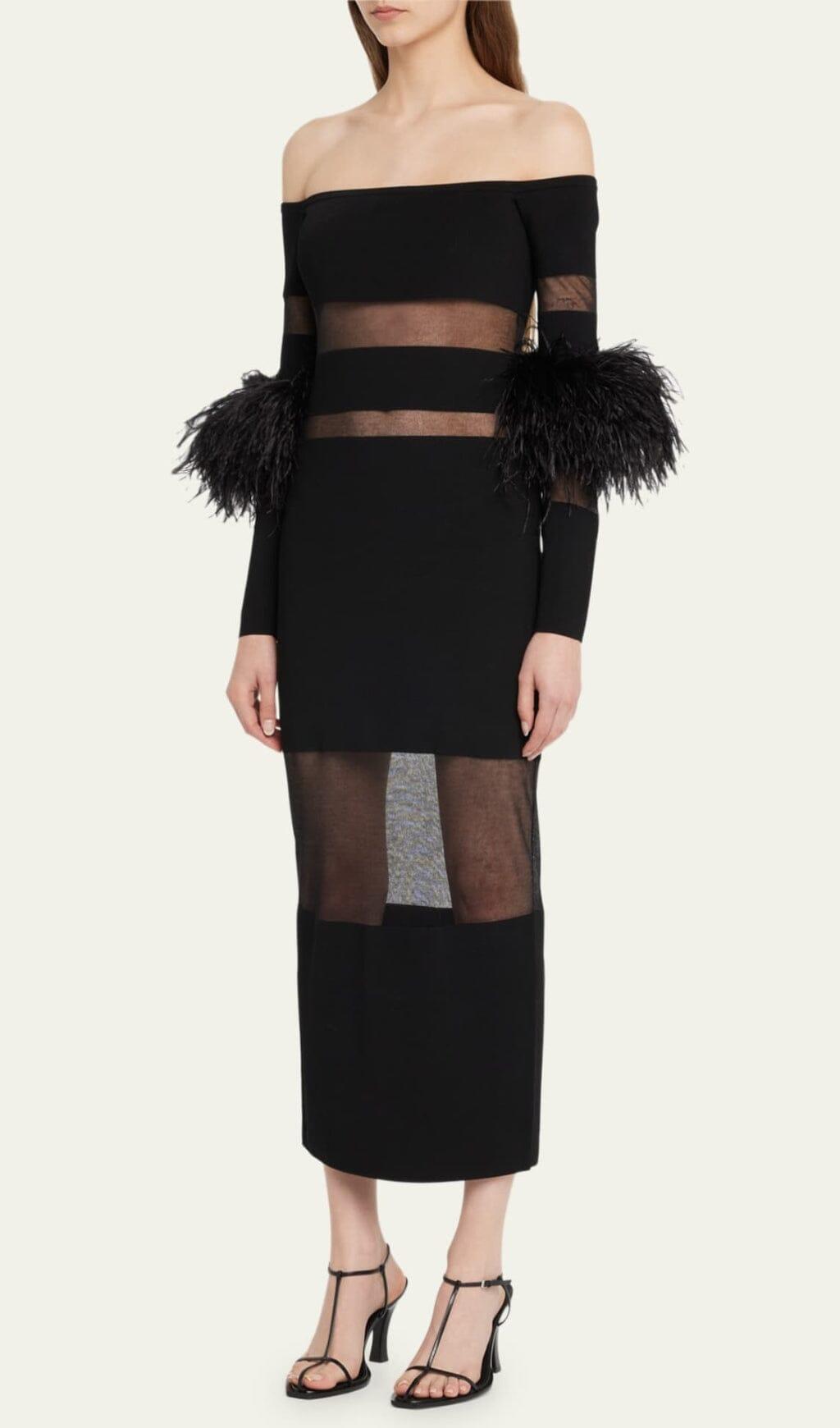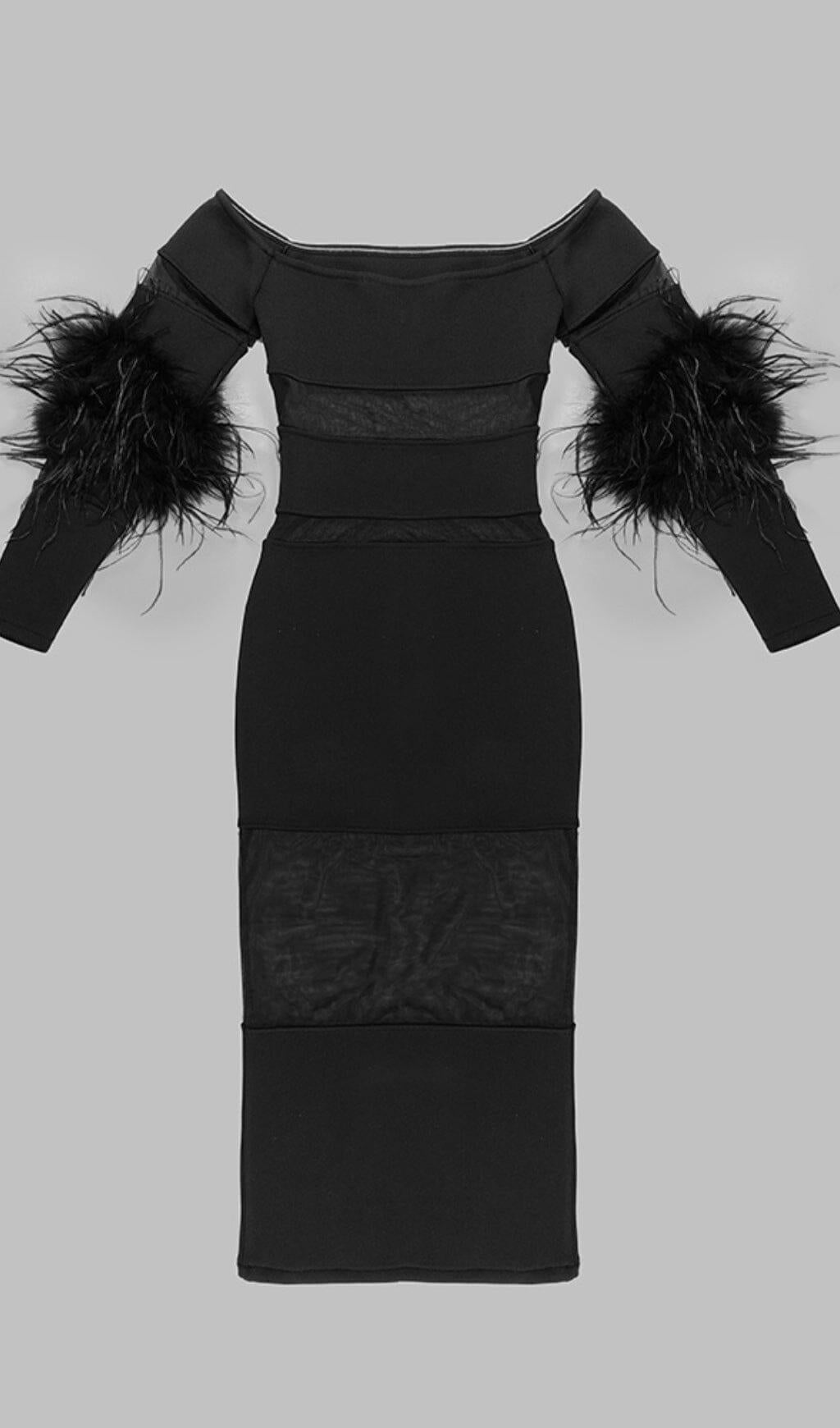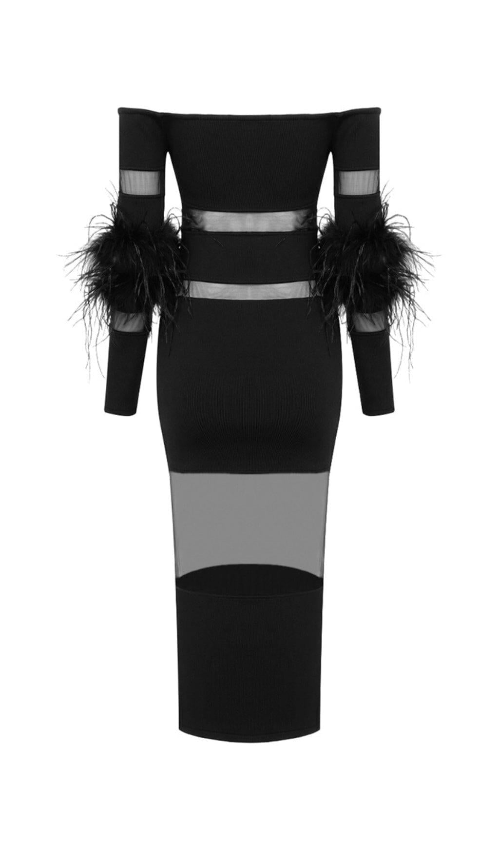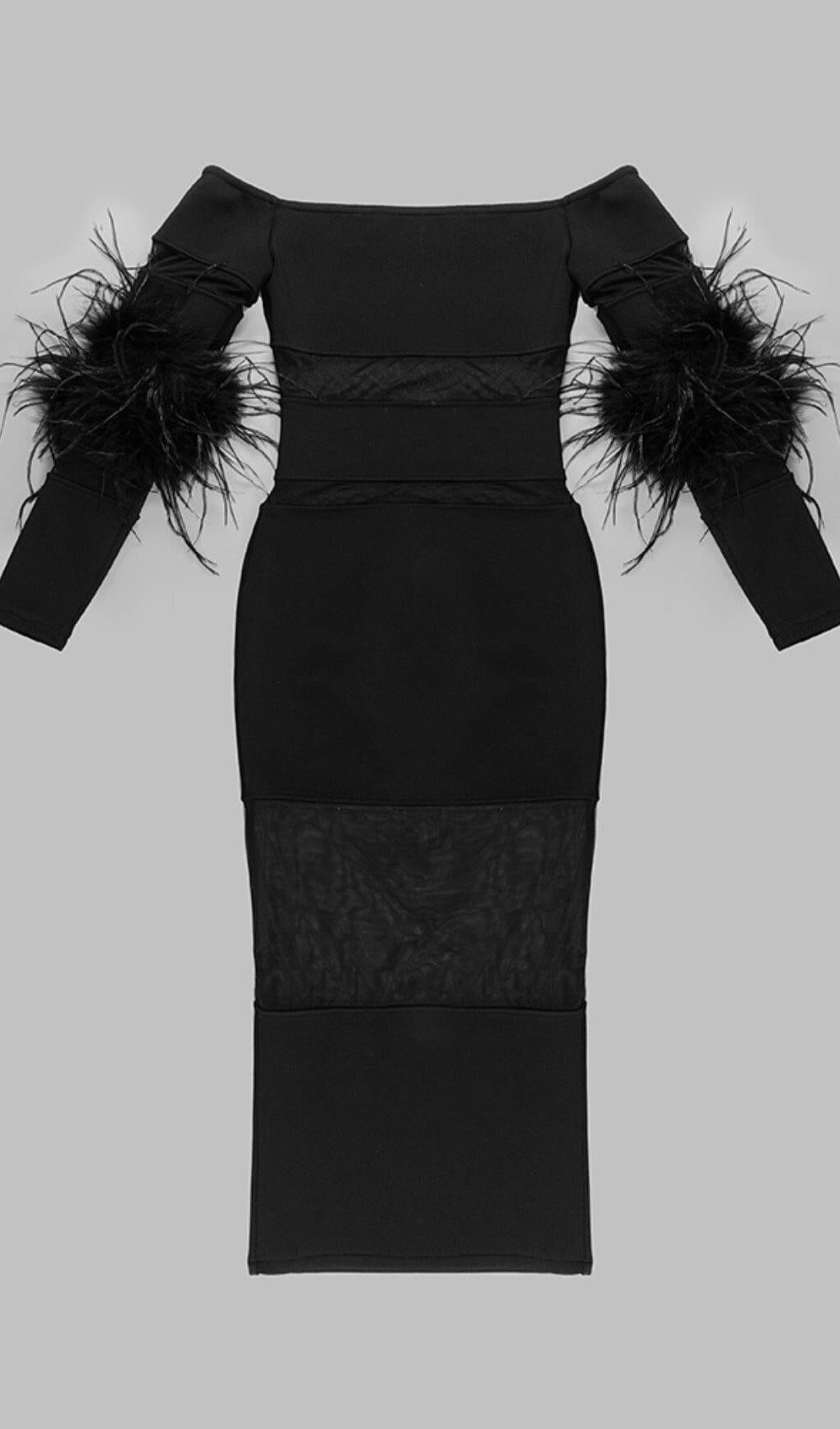 BANDAGE OFF-SHOULDER FEATHER MIDI DRESS IN BLACK