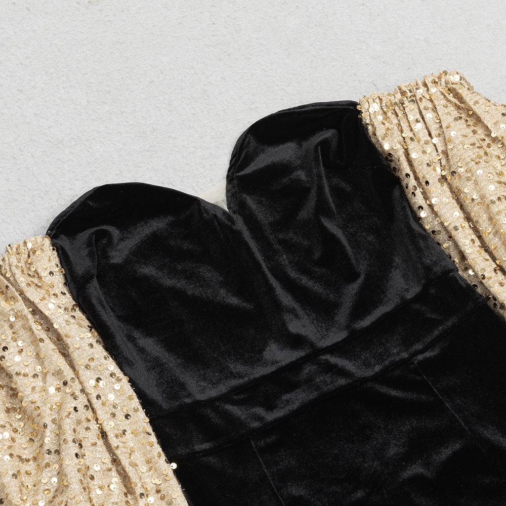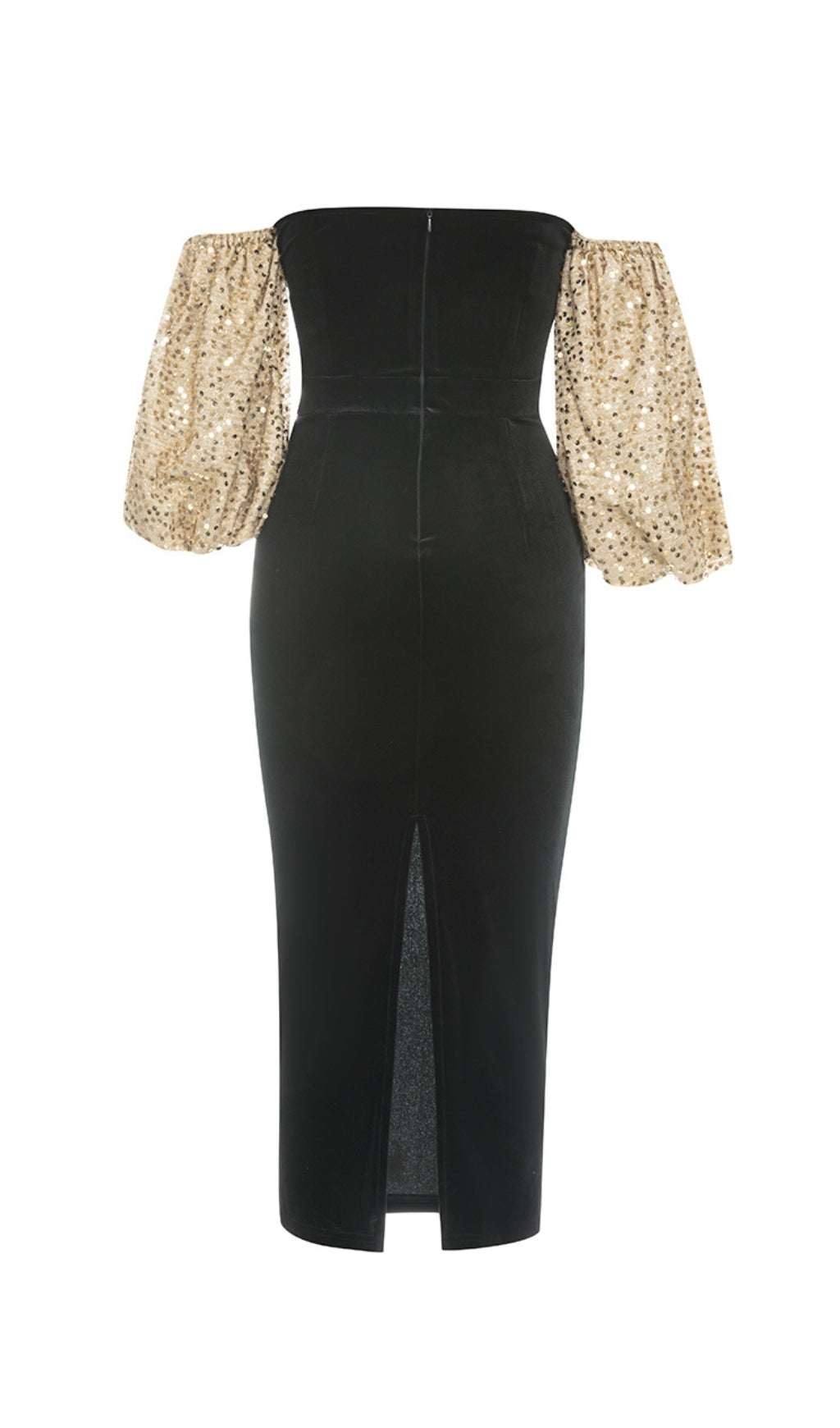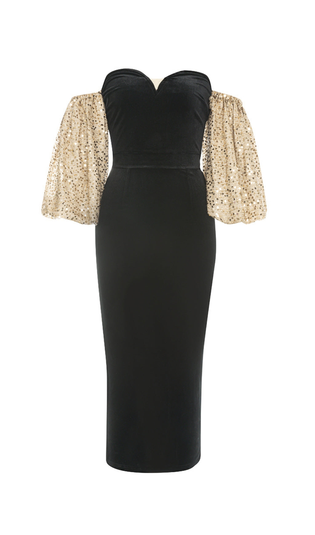 This dress features a chic bandeau neckline and a daring backless design, perfect for turning heads. The voluminous balloon sleeves add a touch of drama while the split midi length keeps it elegant. Elevate your style with this must-have dress.