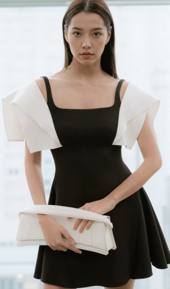 BARBARA BLACK SQUARE NECK MINI DRESS WITH WHITE SHOULDER