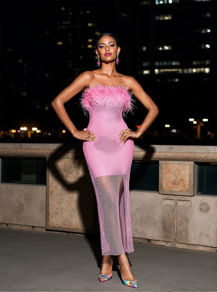 Elevate your style with our Barbie Mesh Rhinestone Maxi Bandage Dress. Featuring a stunning hot pink color and sparkling rhinestone details, this dress is perfect for any special occasion. The mesh fabric adds a touch of glamour and the bandage design flatters your figure.