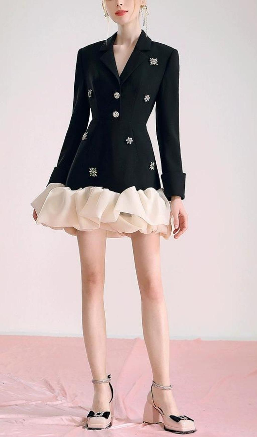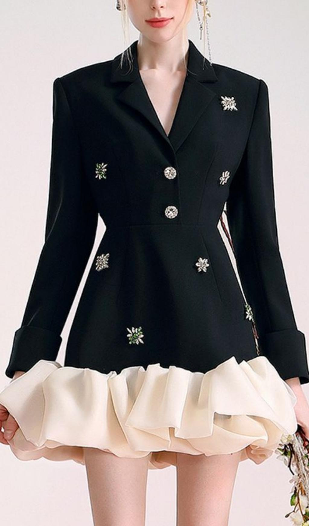 Glam up your wardrobe with this black suit dress! Iridescent beading adds a touch of sparkle, while organza splicing creates a unique, eye-catching silhouette. Slay your next special occasion in this showstopper!