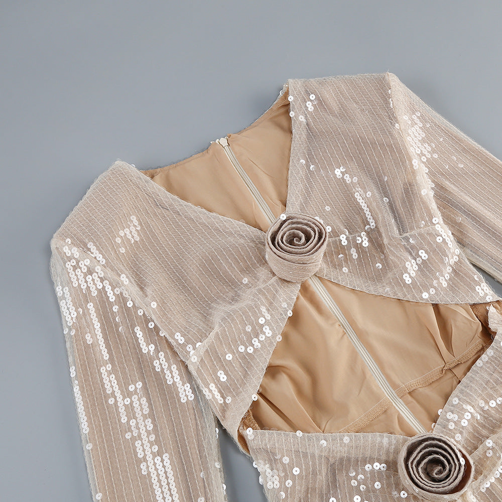 • Allover sequin fabric with rosette appliqués
