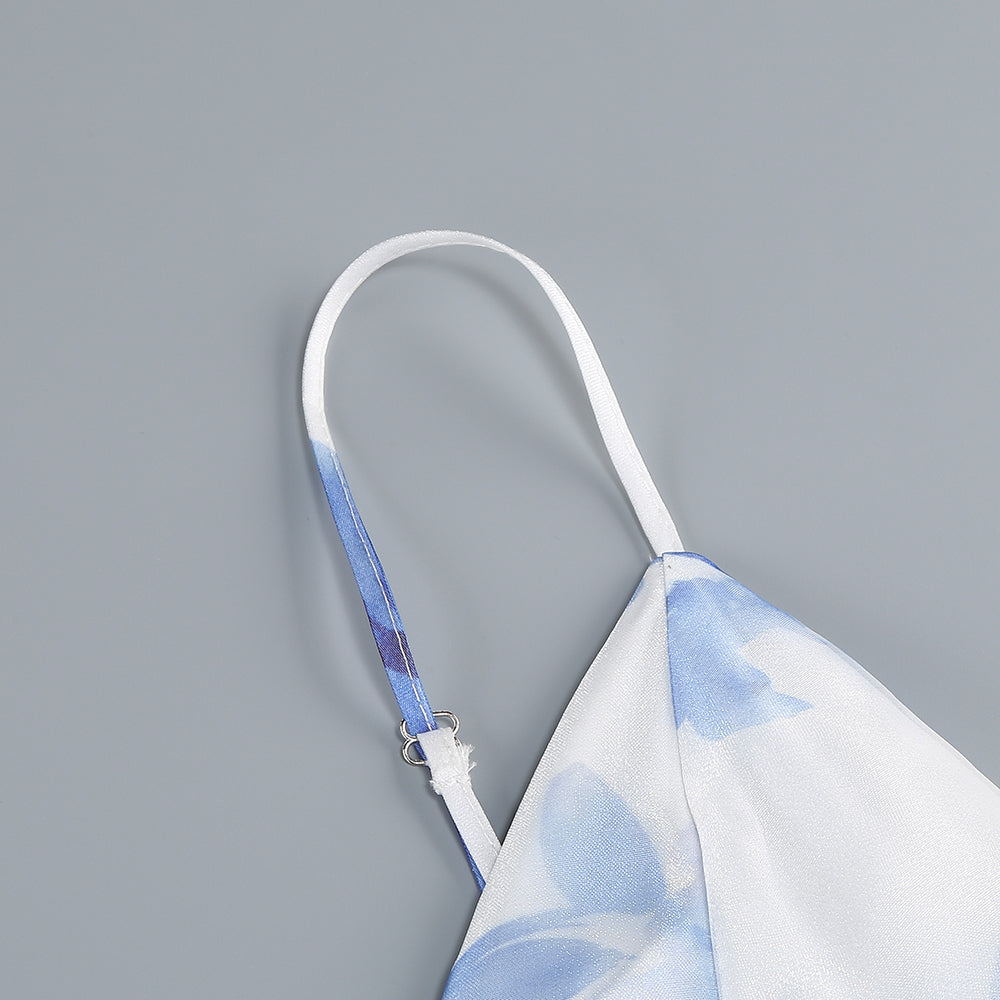Featuring a beautiful blue floral pattern accented with vertical ruffle trims, this dress is perfect for any upscale event. The flowing silhouette and luxurious fabric will make you feel like a work of art.