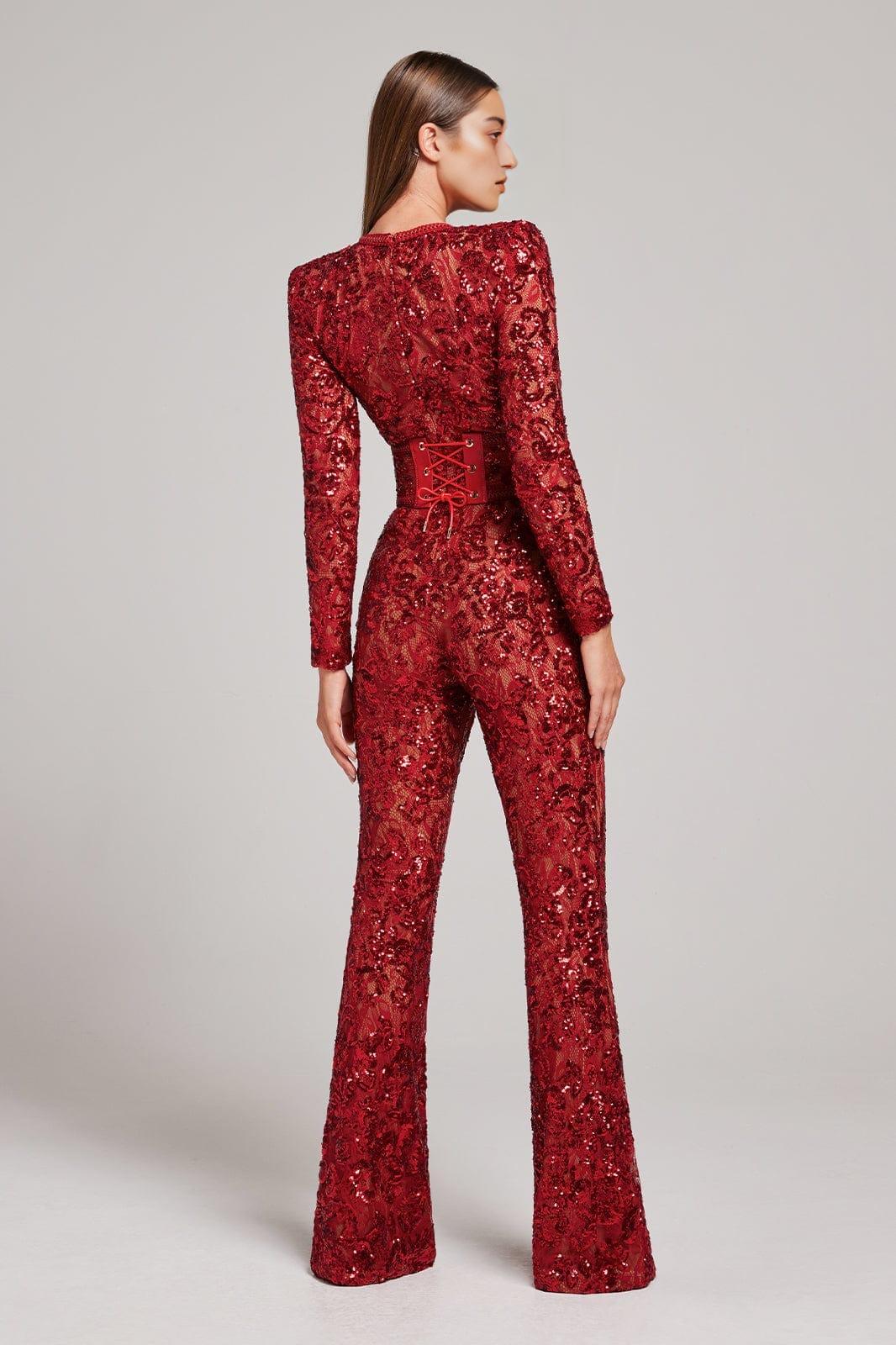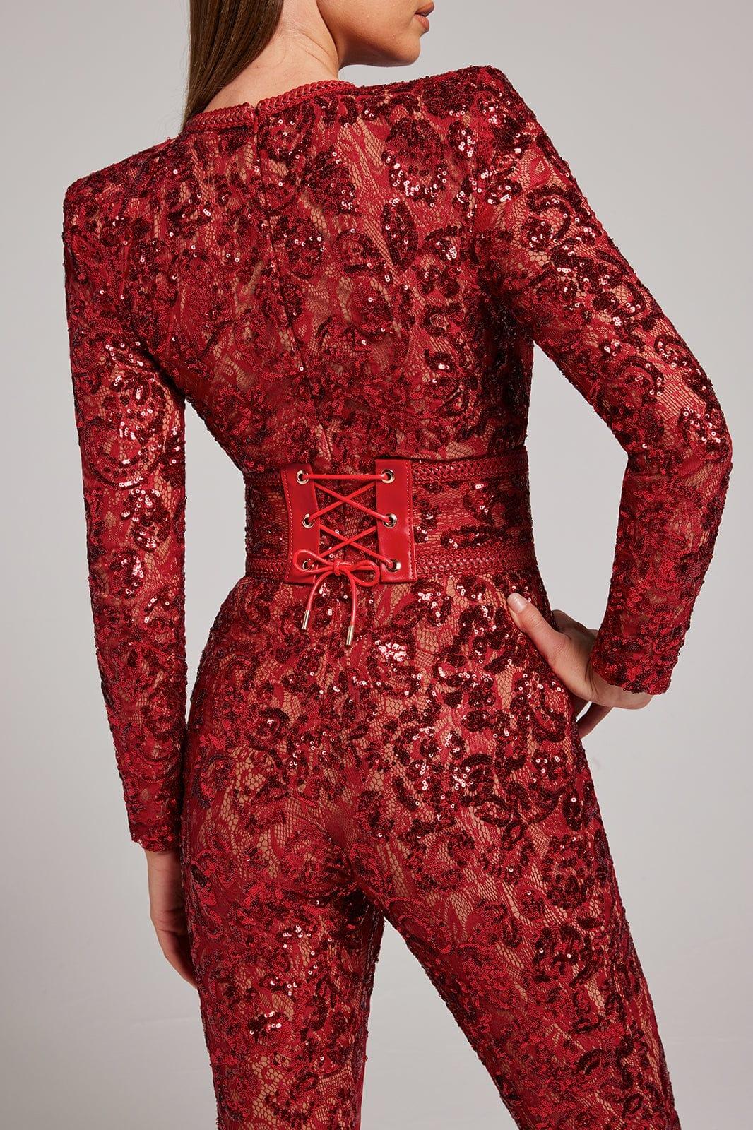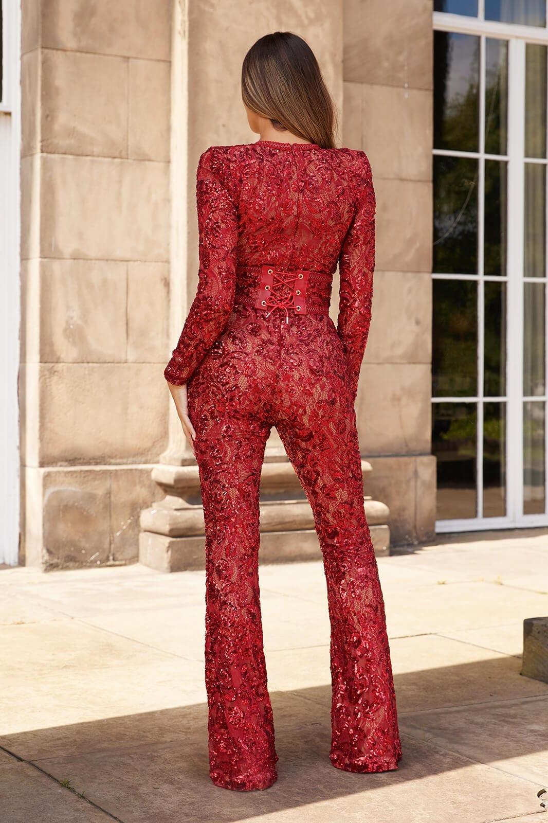 Romance and drama meet with our Embellished Lace Red Jumpsuit. This stunning piece features intricate sequin embellished lace detailing that adds a touch of glamour to any occasion. The jumpsuit is fully lined with nude fabric, providing coverage and enhancing the beauty of the lace. Whether you choose to wear it with or without the lace and leather corset belt, this jumpsuit is guaranteed to make a statement.