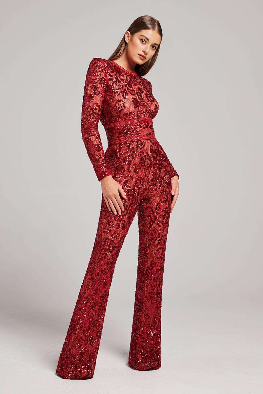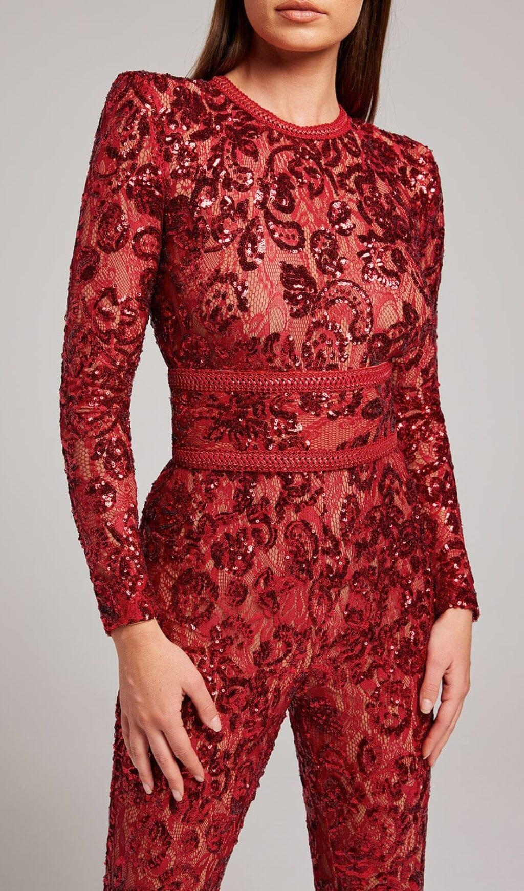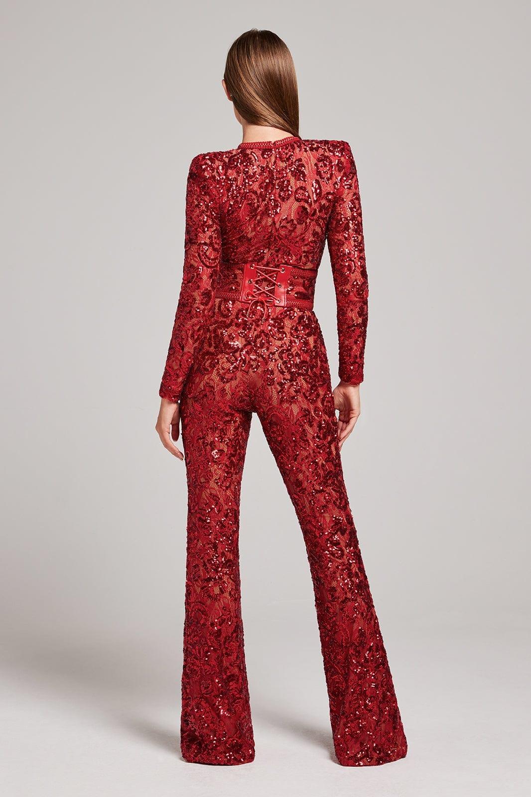 Romance and drama meet with our Embellished Lace Red Jumpsuit. This stunning piece features intricate sequin embellished lace detailing that adds a touch of glamour to any occasion. The jumpsuit is fully lined with nude fabric, providing coverage and enhancing the beauty of the lace. Whether you choose to wear it with or without the lace and leather corset belt, this jumpsuit is guaranteed to make a statement.
