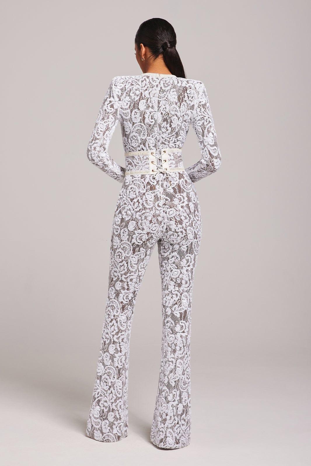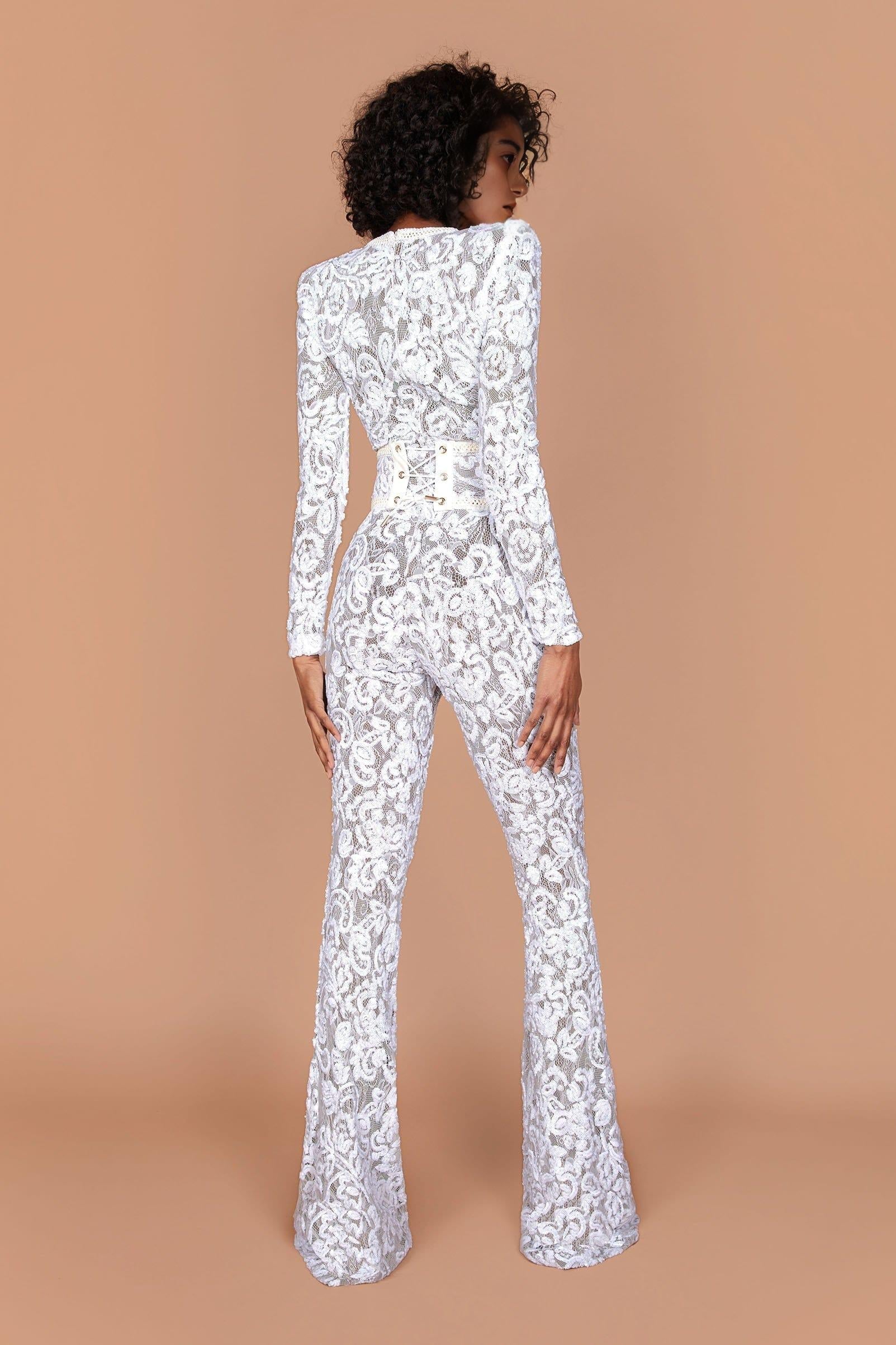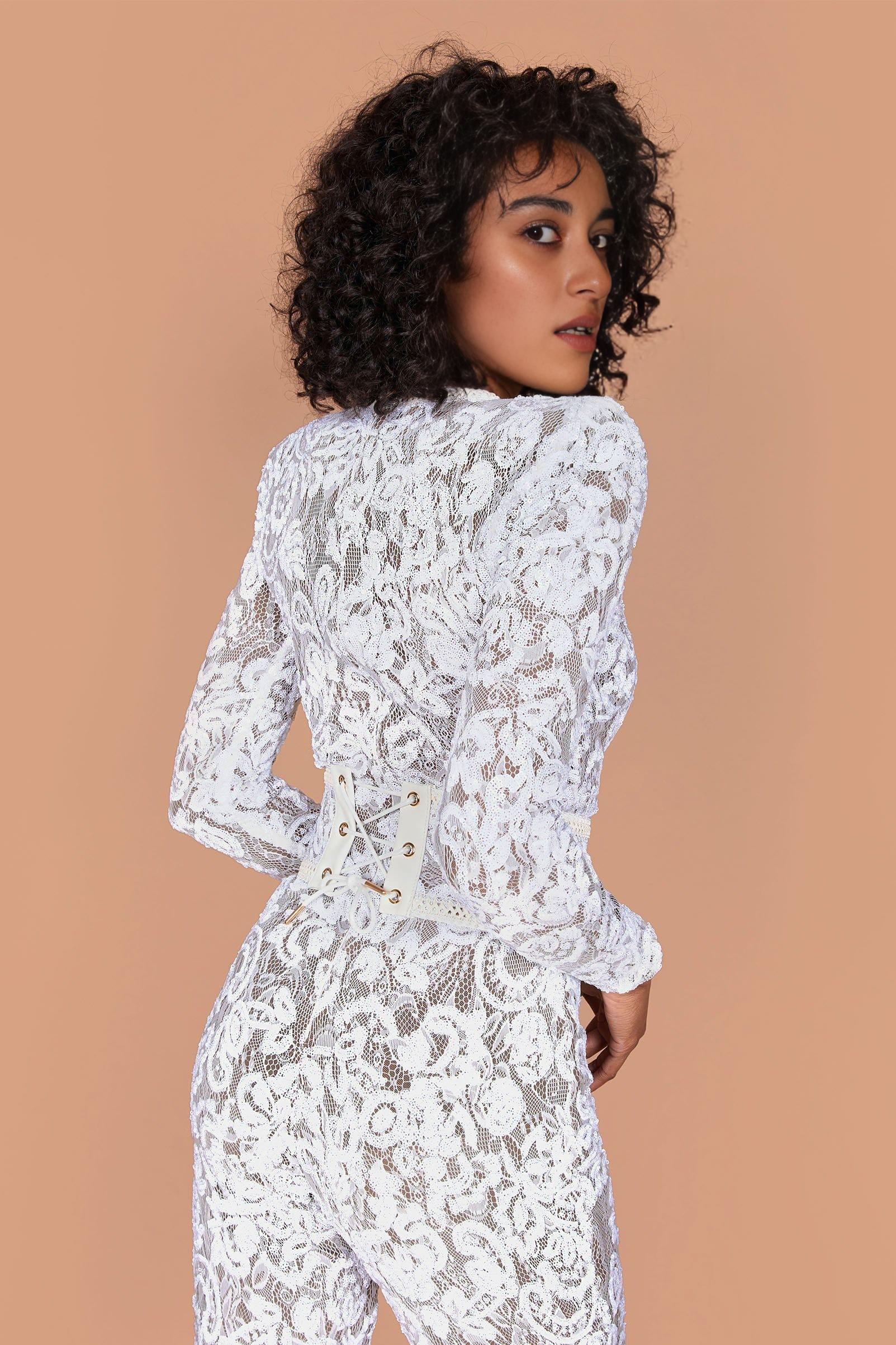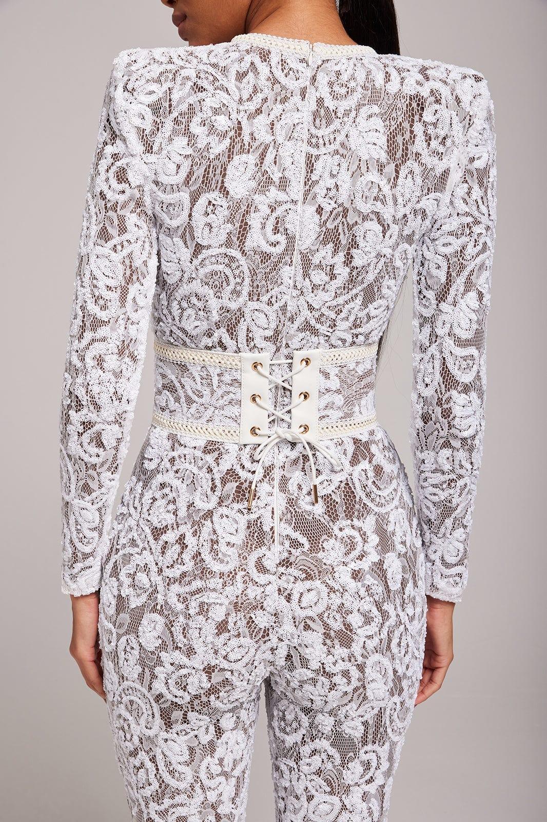 Romance and drama meet with our jumpsuit in white. The dark nude lining provides coverage, whilst accentuating the intricate sequin embellished lace detailing. This style looks equally as good paired with or without the lace and leather corset belt.