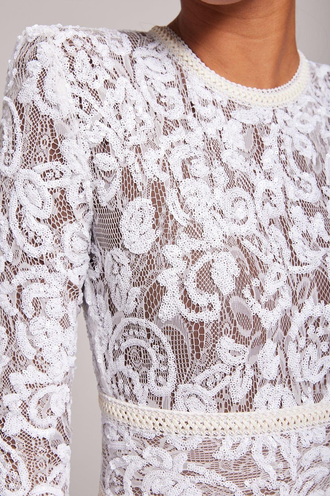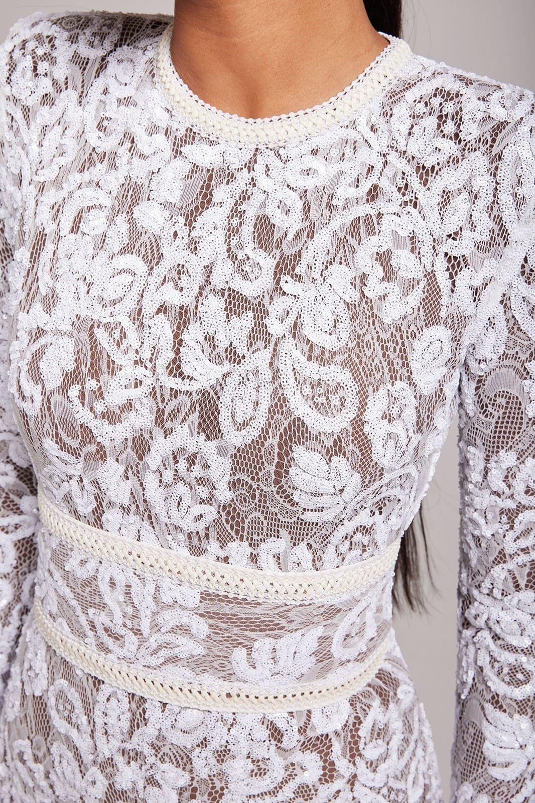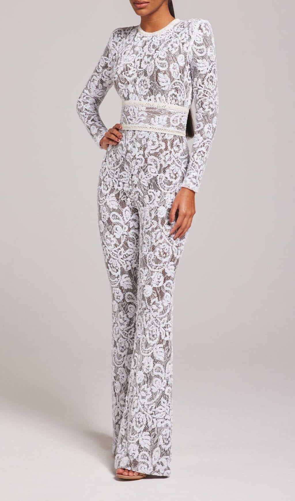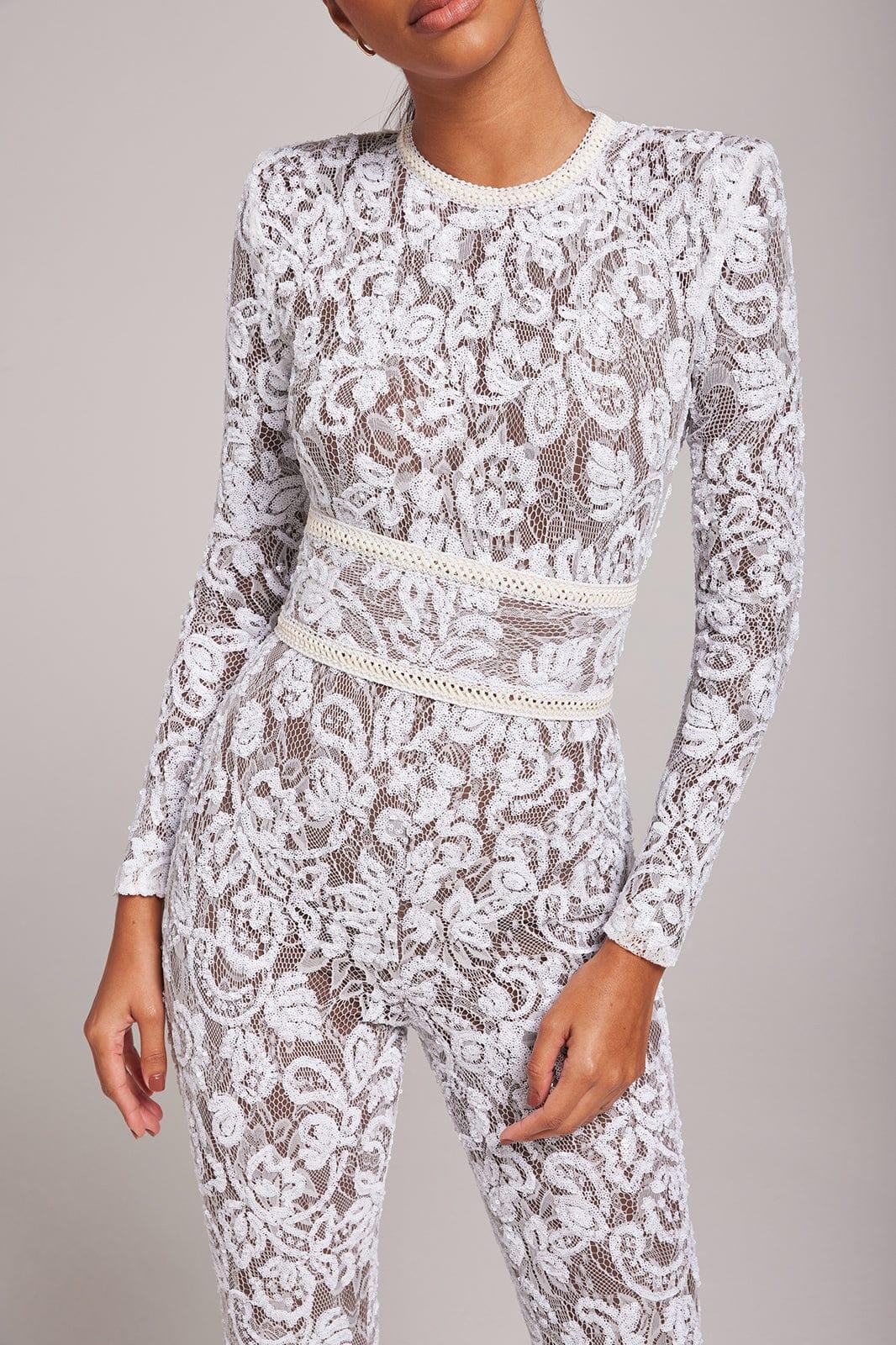 Romance and drama meet with our jumpsuit in white. The dark nude lining provides coverage, whilst accentuating the intricate sequin embellished lace detailing. This style looks equally as good paired with or without the lace and leather corset belt.