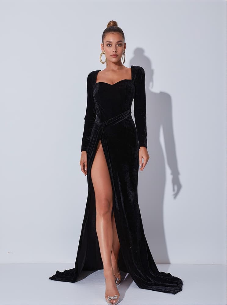 Flaunt this Bernice Long Sleeve Gloves Velvet Maxi Dress In Black for upcoming events and look effortlessly stylish wherever you go. Made out of velvet, this beautiful dress captures the feel of old Hollywood with the refreshing energy of the modern era. This luxe design features a corset-inspired bodice with a mermaid skirt in velvet fabrication. Adorned with black tones, it comes with detachable gloves for a versatile and dramatic appeal.