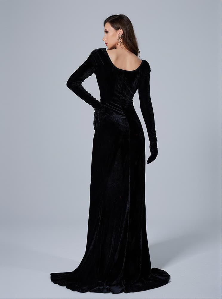 Bernice Long Sleeve Gloves Velvet Maxi Dress In Black