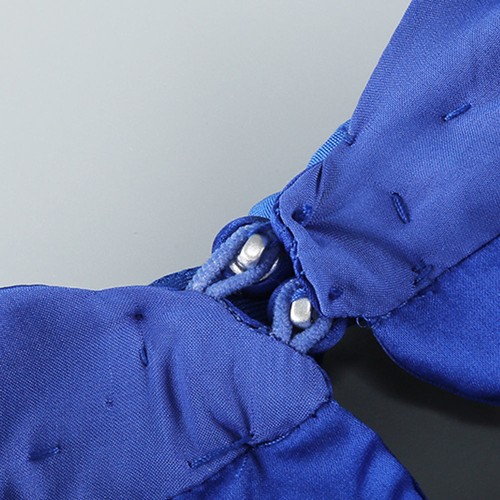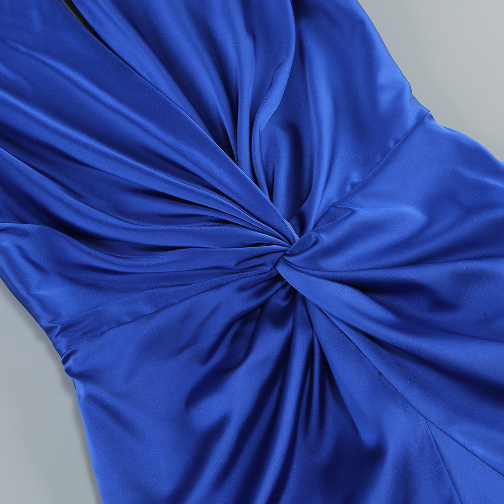 BEVERLY BRAID EMBELLISHED RUCHED HALTER GOWN IN BLUE