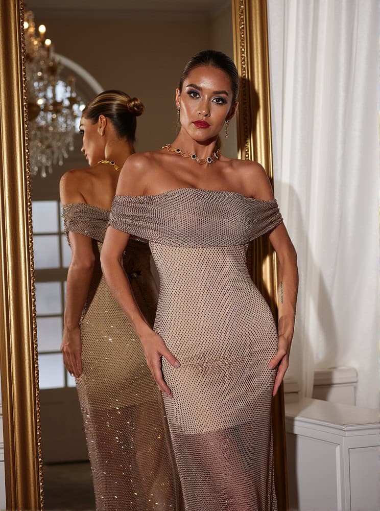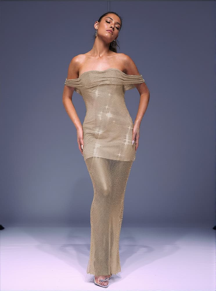 Bexley Off Shoulder Mesh Rhinestone Maxi Dress