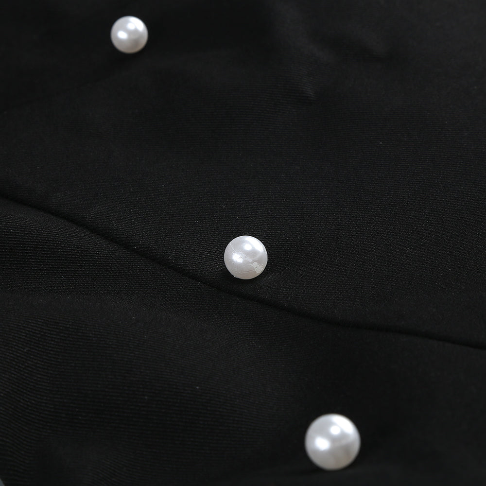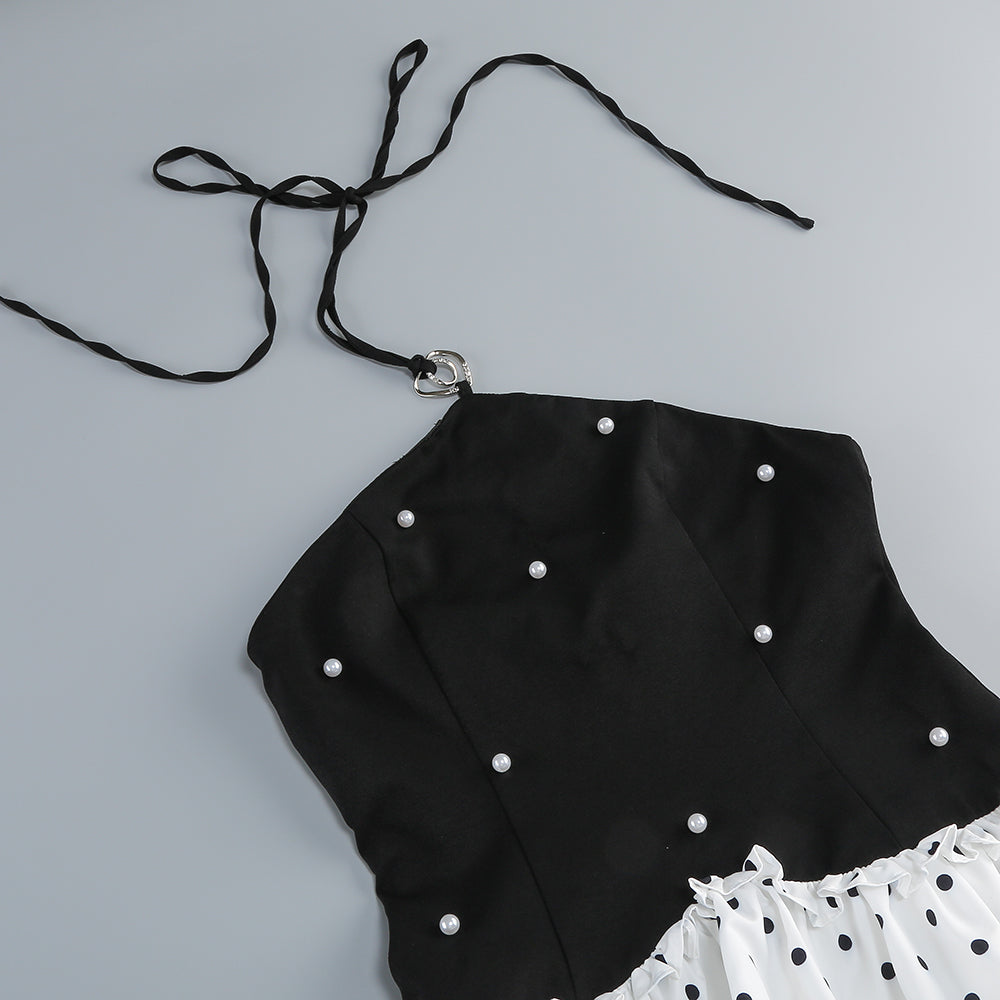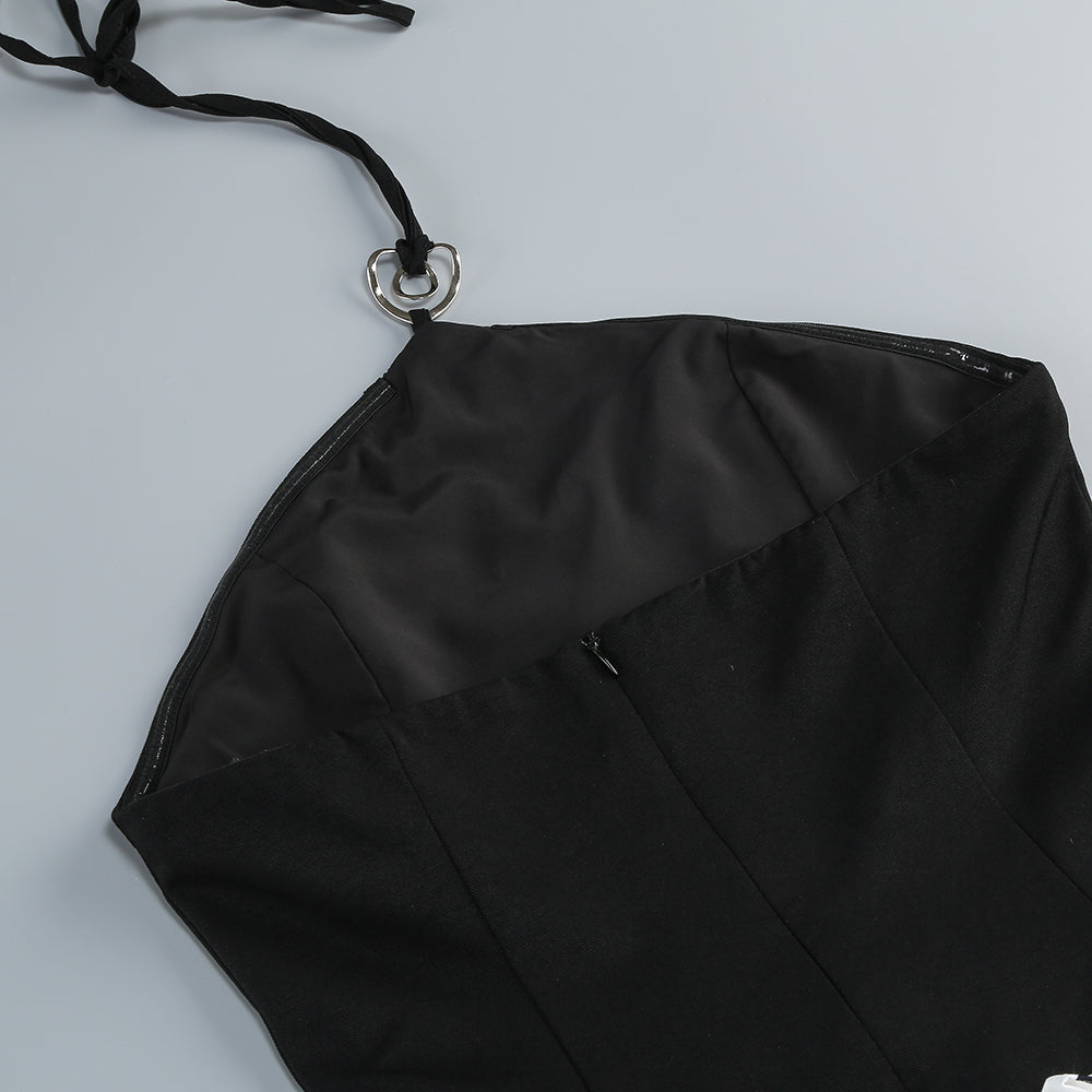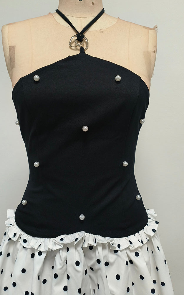 This is a uniquely designed dress. The upper part is a black halter - neck style. The halter neck is adorned with a metal ring buckle, adding a touch of sophistication. The bodice is embellished with pearls, highlighting an elegant charm. It also clings to the body, showcasing the wearer's figure.