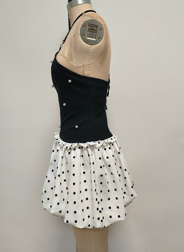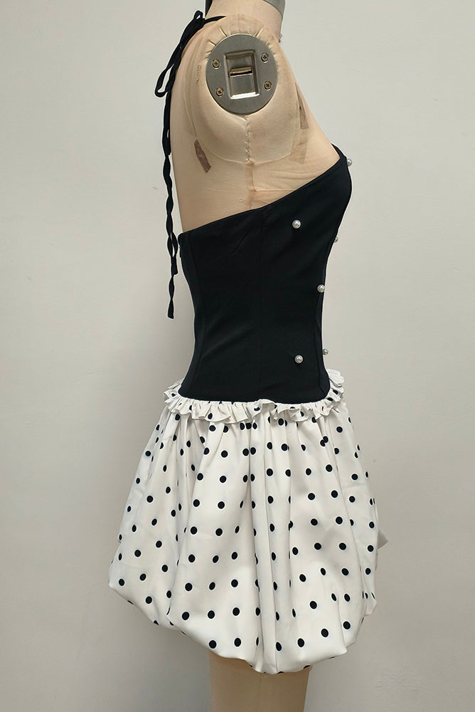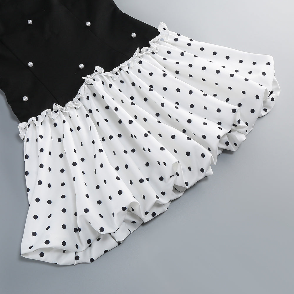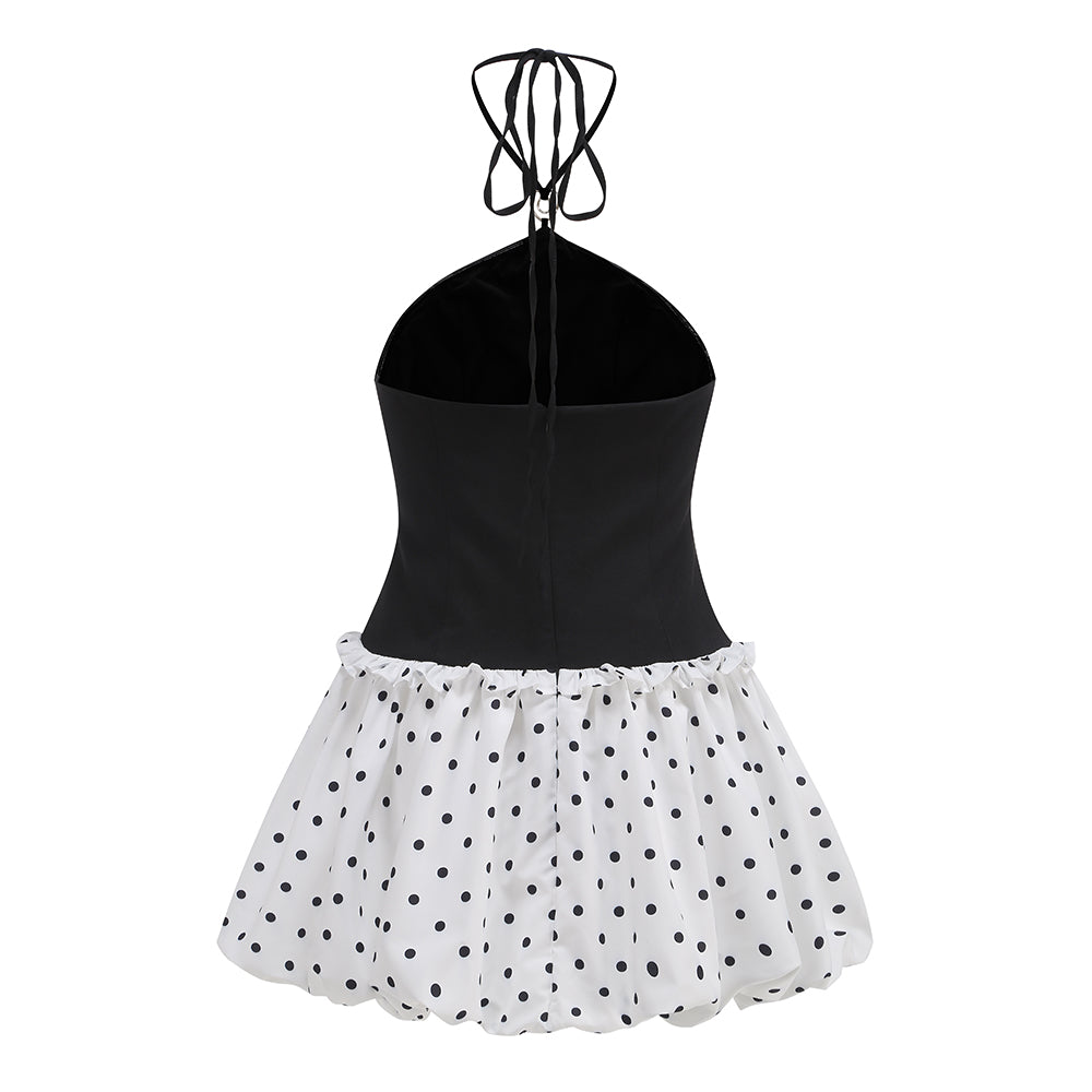 The lower part is a white polka - dot puffy short skirt. The polka - dot element is classic and playful, and the puffy skirt is lively and cute. It creates a contrast in style with the upper part while still maintaining harmony. The overall look is stylish and eye - catching, making it suitable for parties, fashion events, and other occasions where one wants to stand out. The large white butterfly - shaped earrings further enhance the sweet and distinctive style.