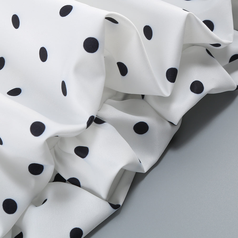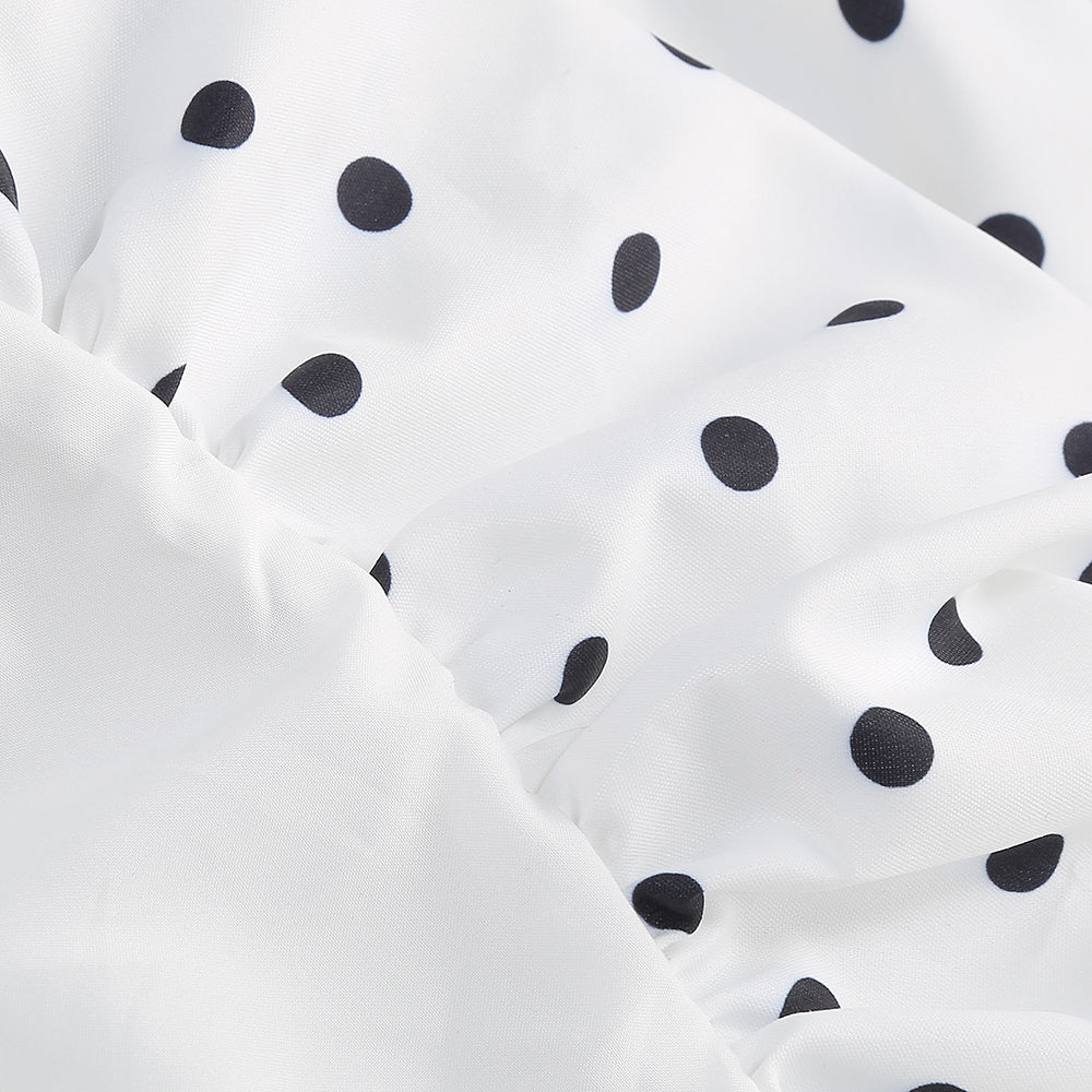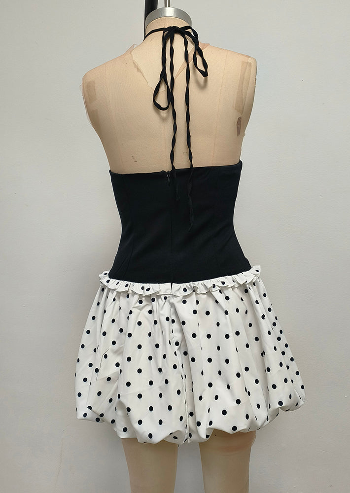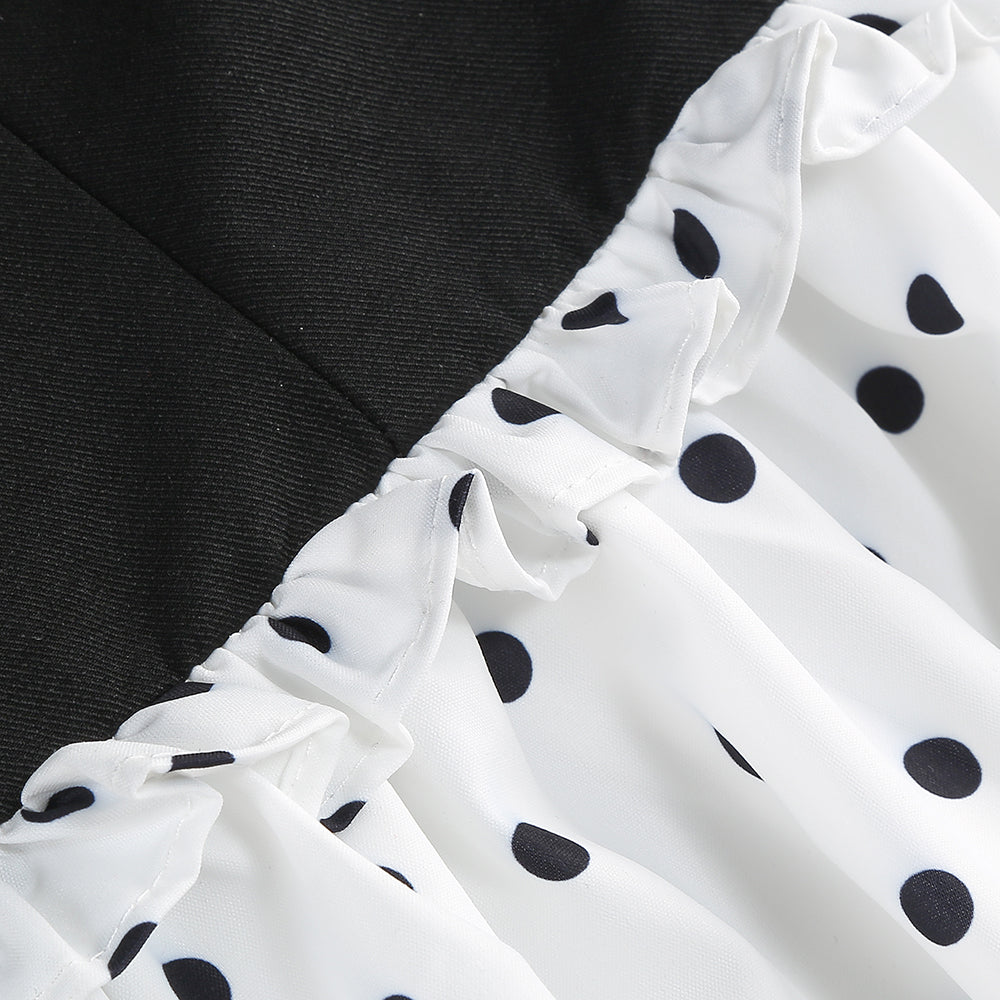 The lower part is a white polka - dot puffy short skirt. The polka - dot element is classic and playful, and the puffy skirt is lively and cute. It creates a contrast in style with the upper part while still maintaining harmony. The overall look is stylish and eye - catching, making it suitable for parties, fashion events, and other occasions where one wants to stand out. The large white butterfly - shaped earrings further enhance the sweet and distinctive style.
