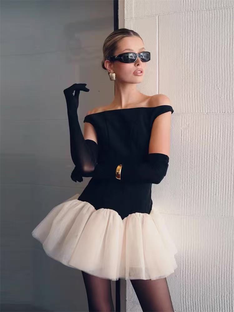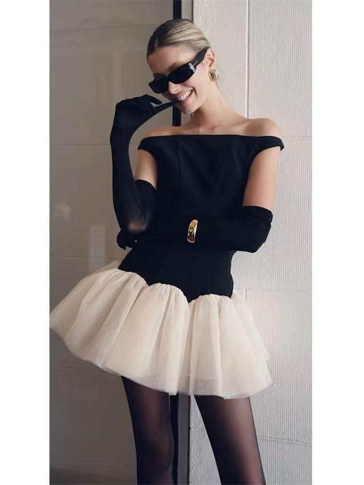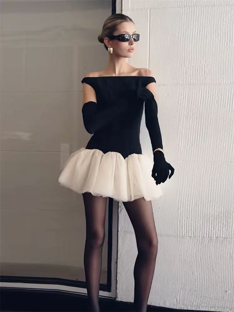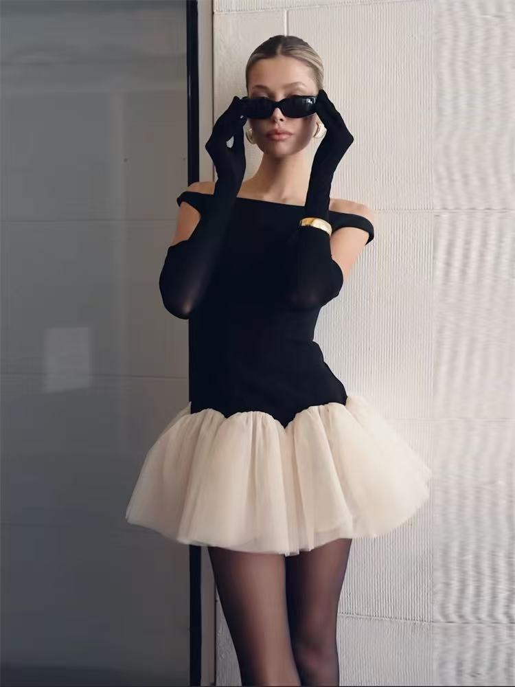 Lower part: The white puffy skirt is made of light - weight 纱质 (sandy - textured) material, resembling a ballet skirt and creating a sweet and playful atmosphere. The black - and - white color scheme is classic and stylish, with a sharp contrast that gives a strong visual impact.