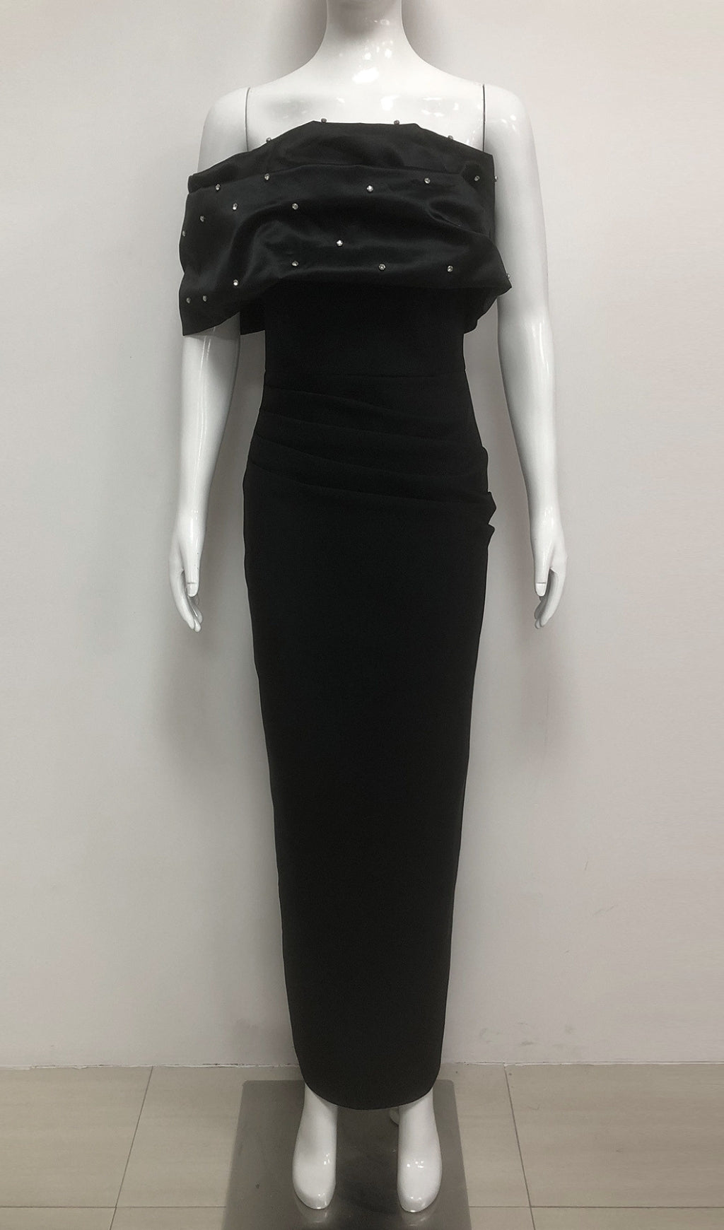BLACK BEADED OFF SHOULDER RUCHED BODYCON MAXI DRESS