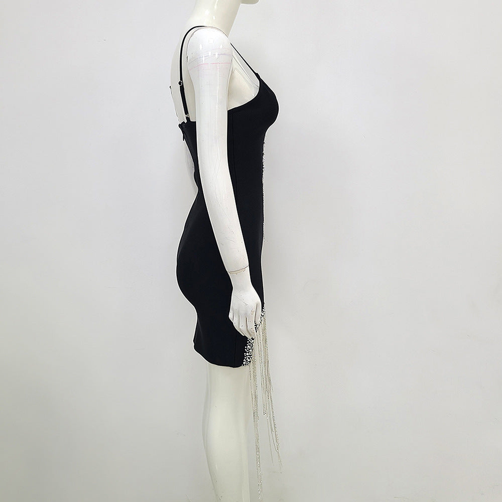 Shine bright like a diamond in this black, figure-hugging mini dress. Perfect for a night out, the diamond embellishments add a touch of sparkle to your look. Be the center of attention with this unique bandage-style dress. (Warning: may cause dress envy).