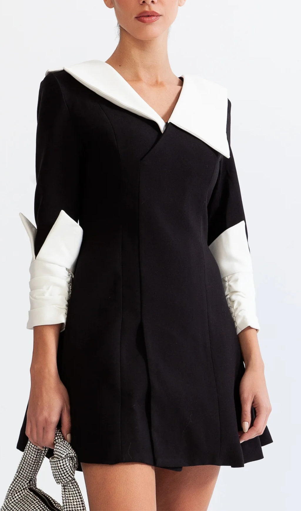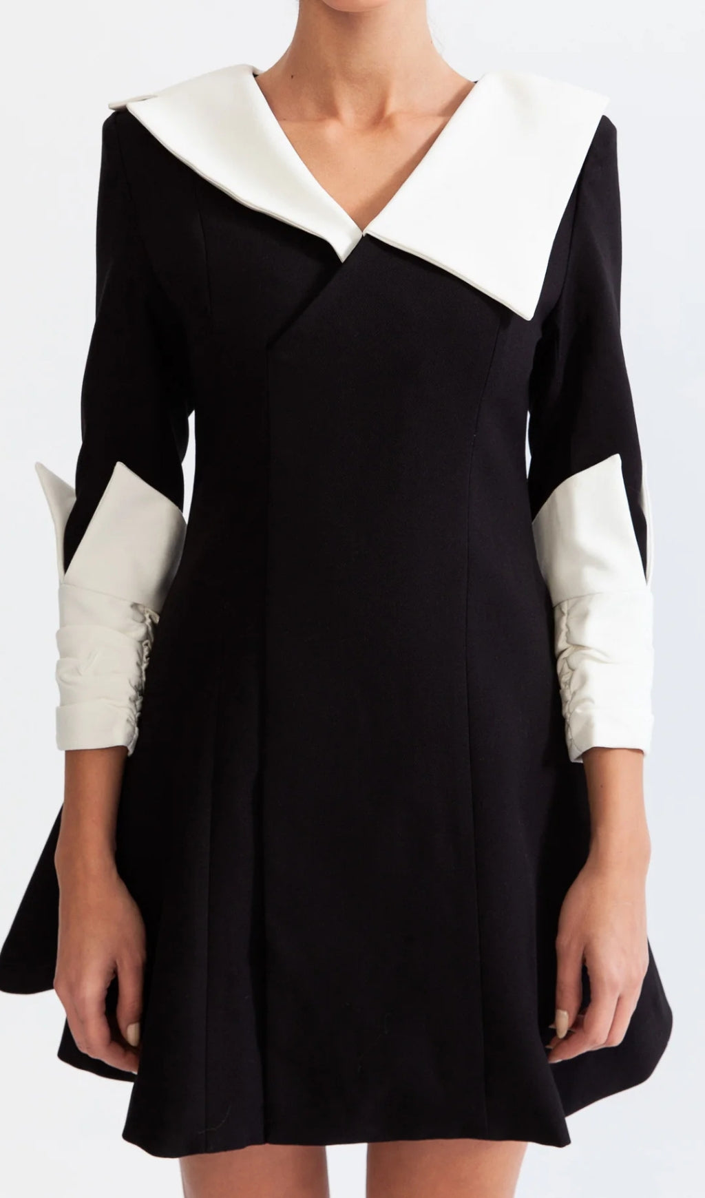 This classic black doll dress offers a timeless style with a modern twist. Featuring a contrastant white collar and cuffs, V-neck and slim sleeves, this dress has a highlighted waist for an accentuated silhouette. Perfect for special occasions.
