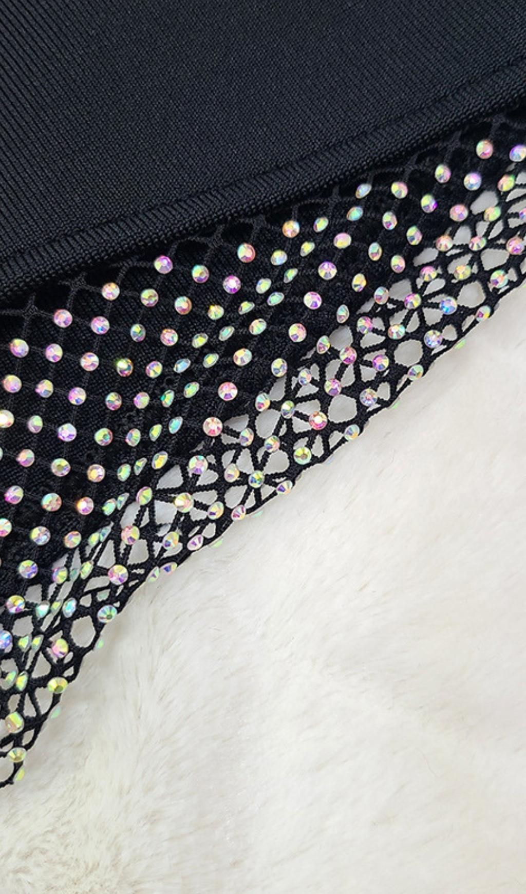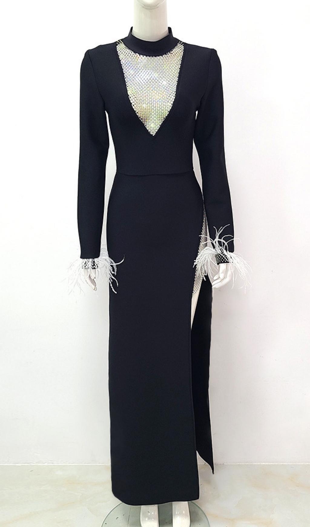 BLACK FEATHER LONG SLEEVE BANDAGE MAXI DRESS