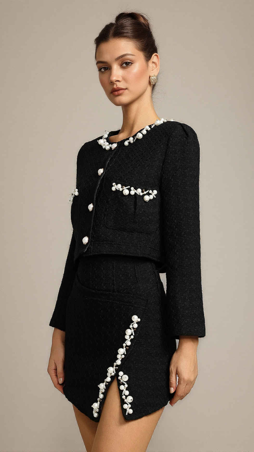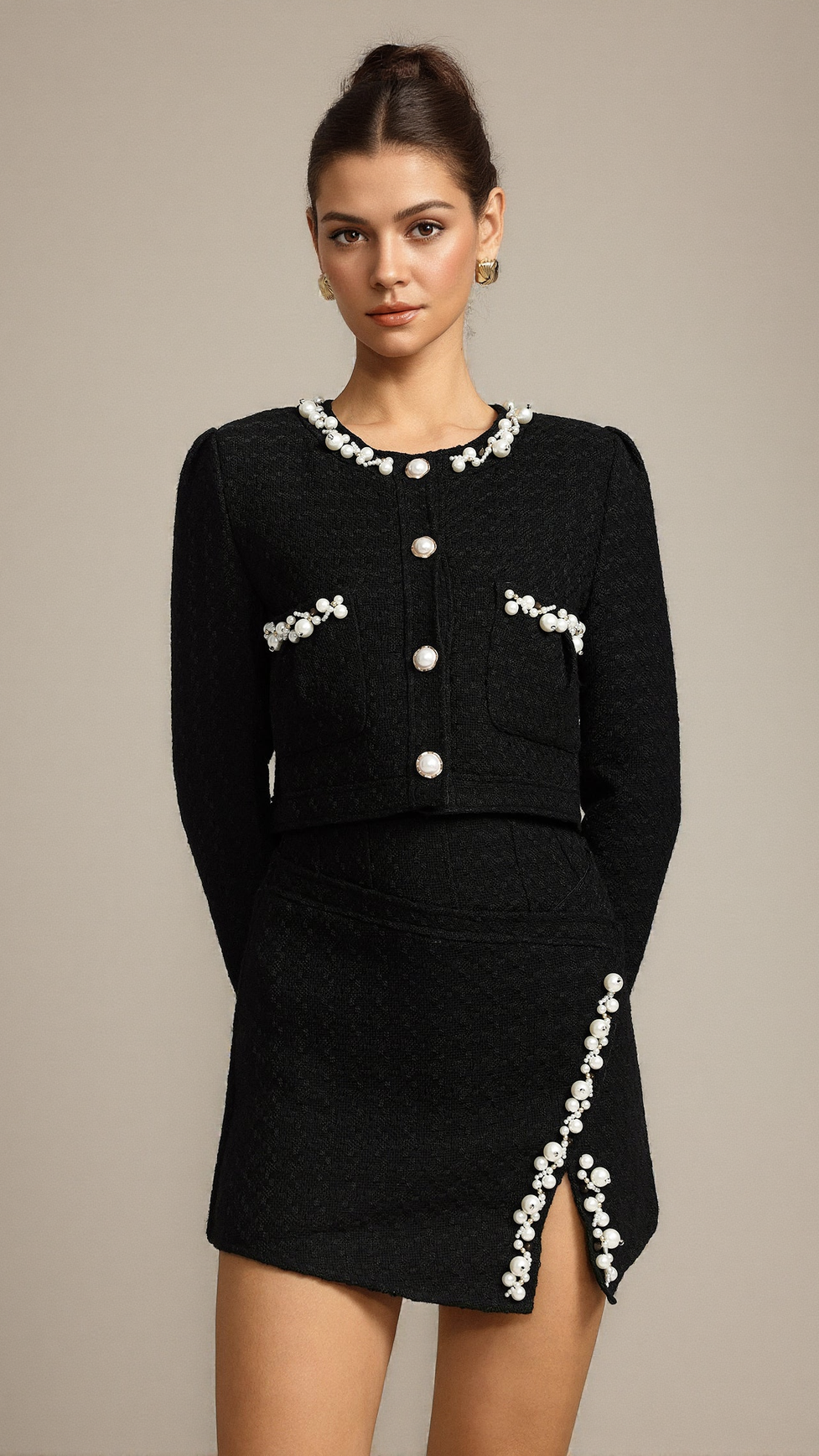 BLACK GRACE LONG SLEEVES PEARL TOP & SKIRT TWO-PIECE SET