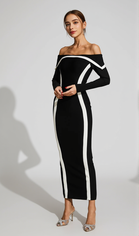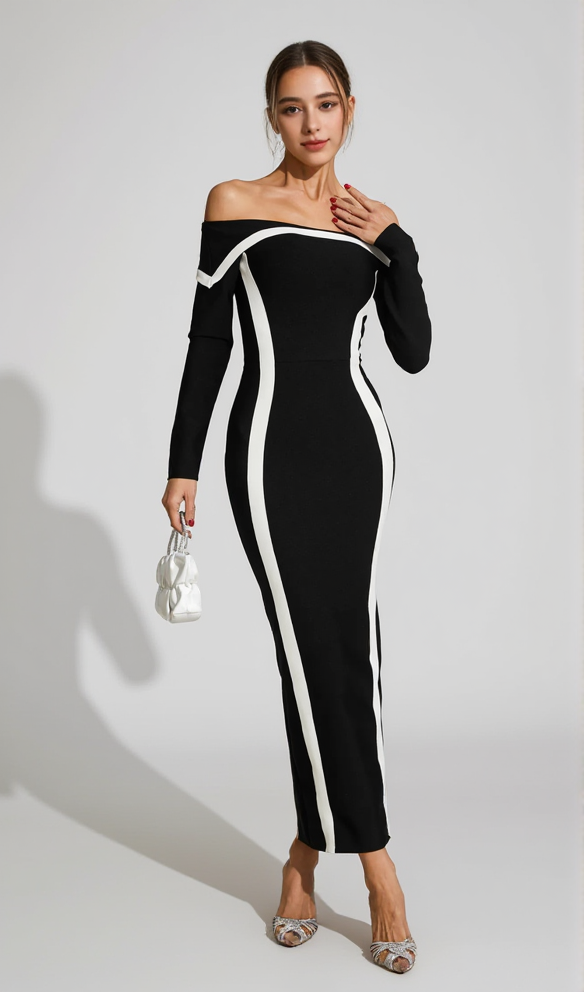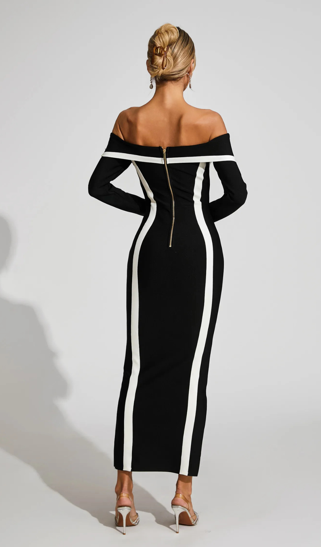 Be a vision of elegance and style in our Black Janet Off Shoulder Maxi Dress. Featuring a sophisticated contrast design with an off the shoulder neckline and fold-over edge. Crafted from a single lined knit fabric offering both comfort and style. Stretchy.