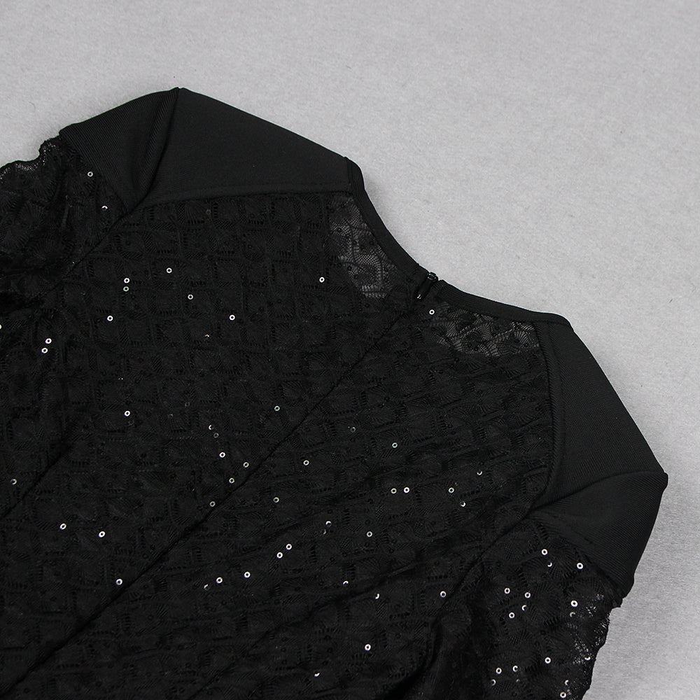 -Bodycon fitted jumpsuit featuring our exclusively designed stretch lace -Feather trim to cuff -Fully lined -Shoulder pads -Contrast Black belt