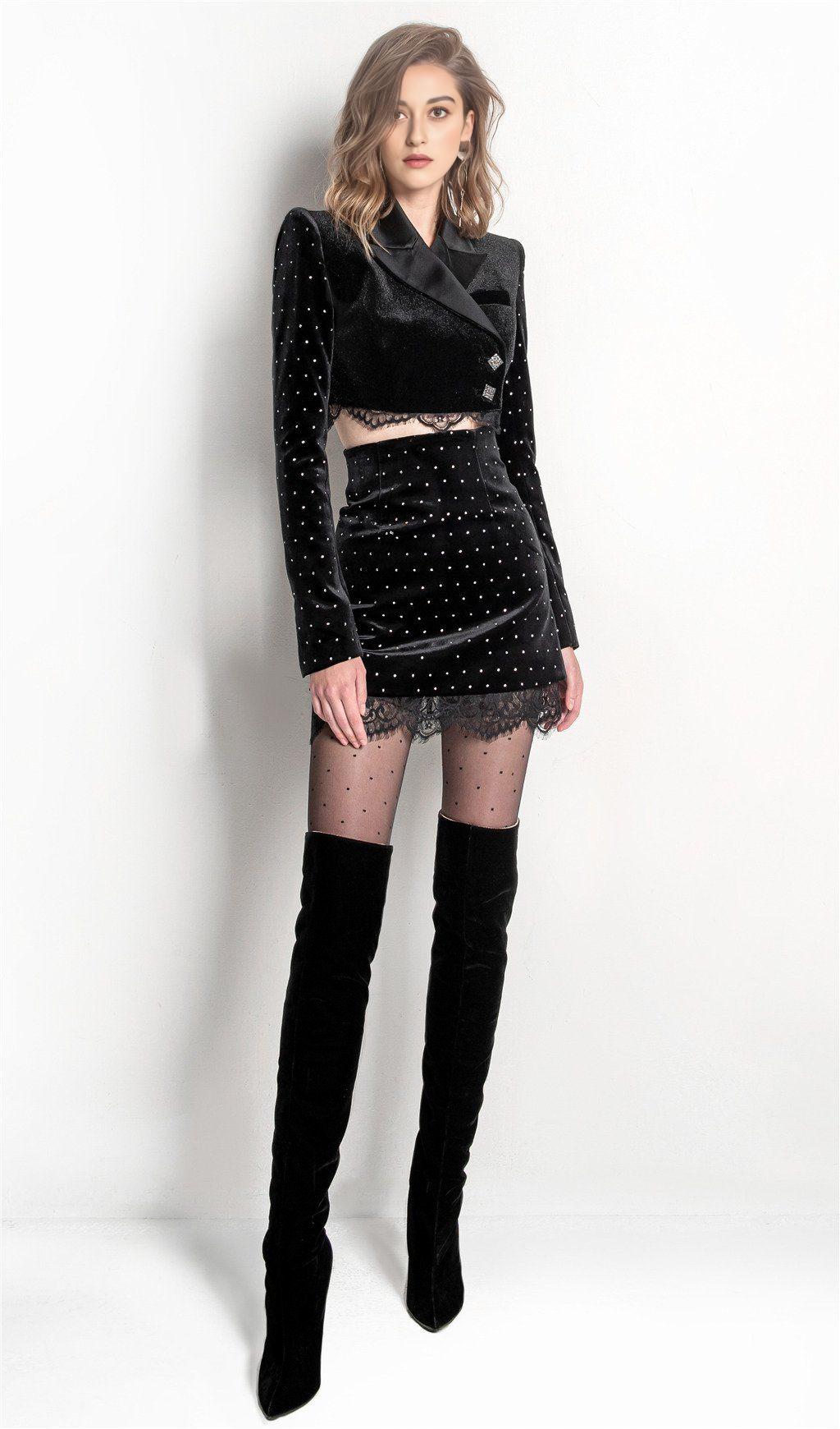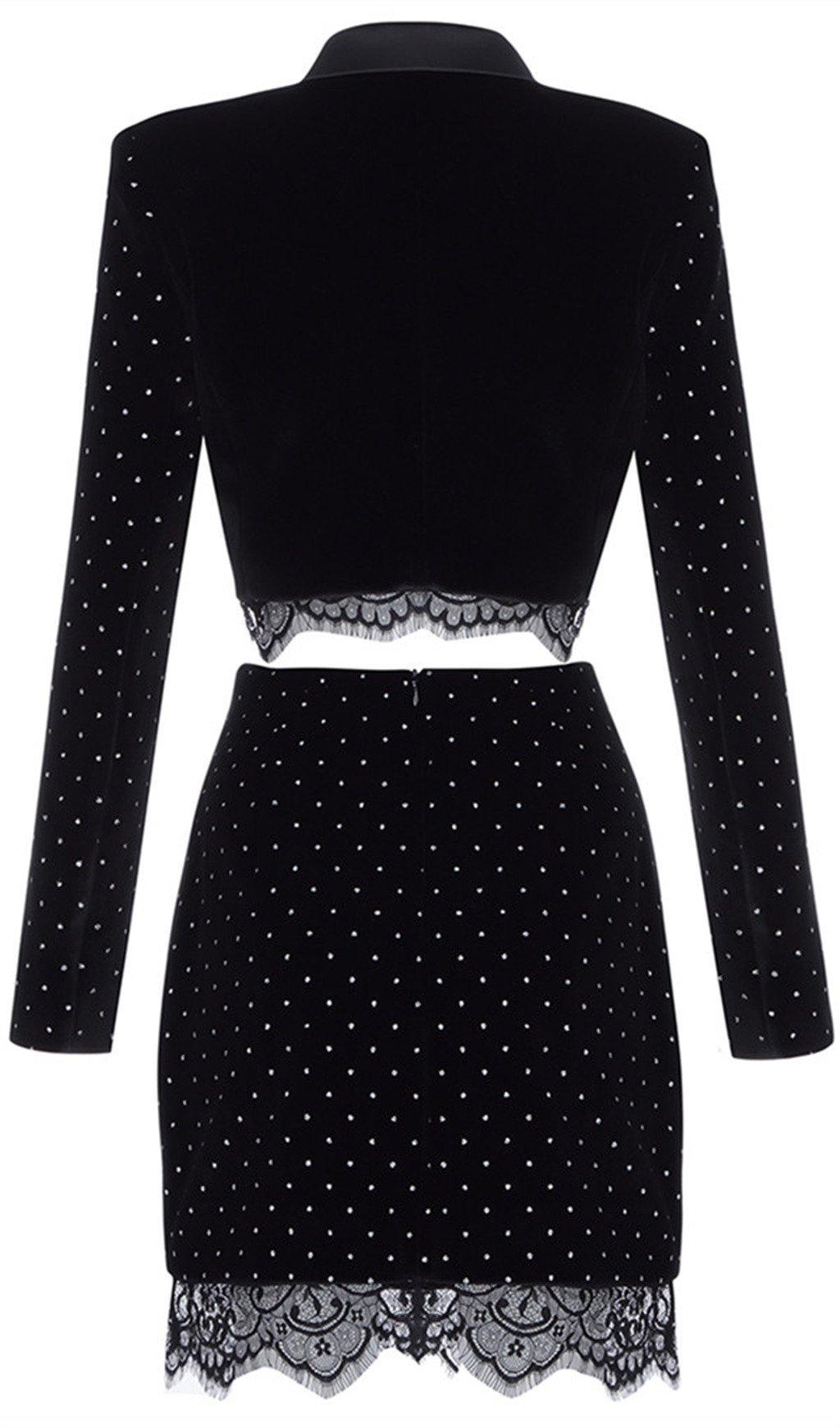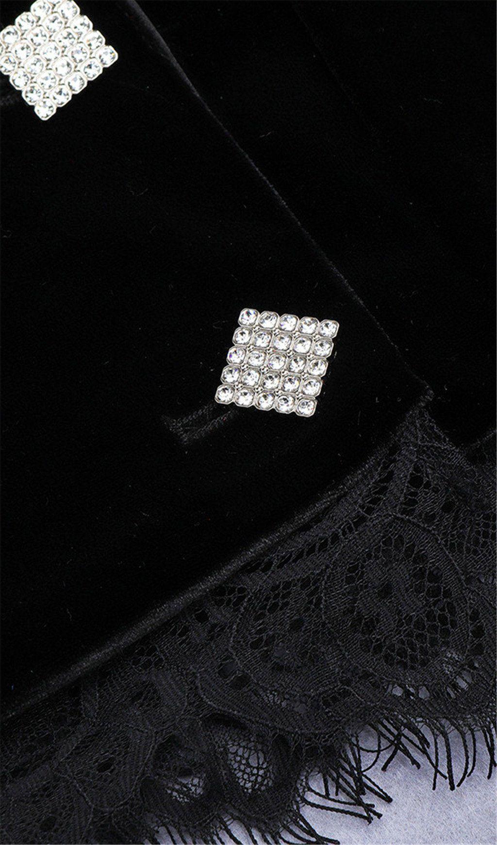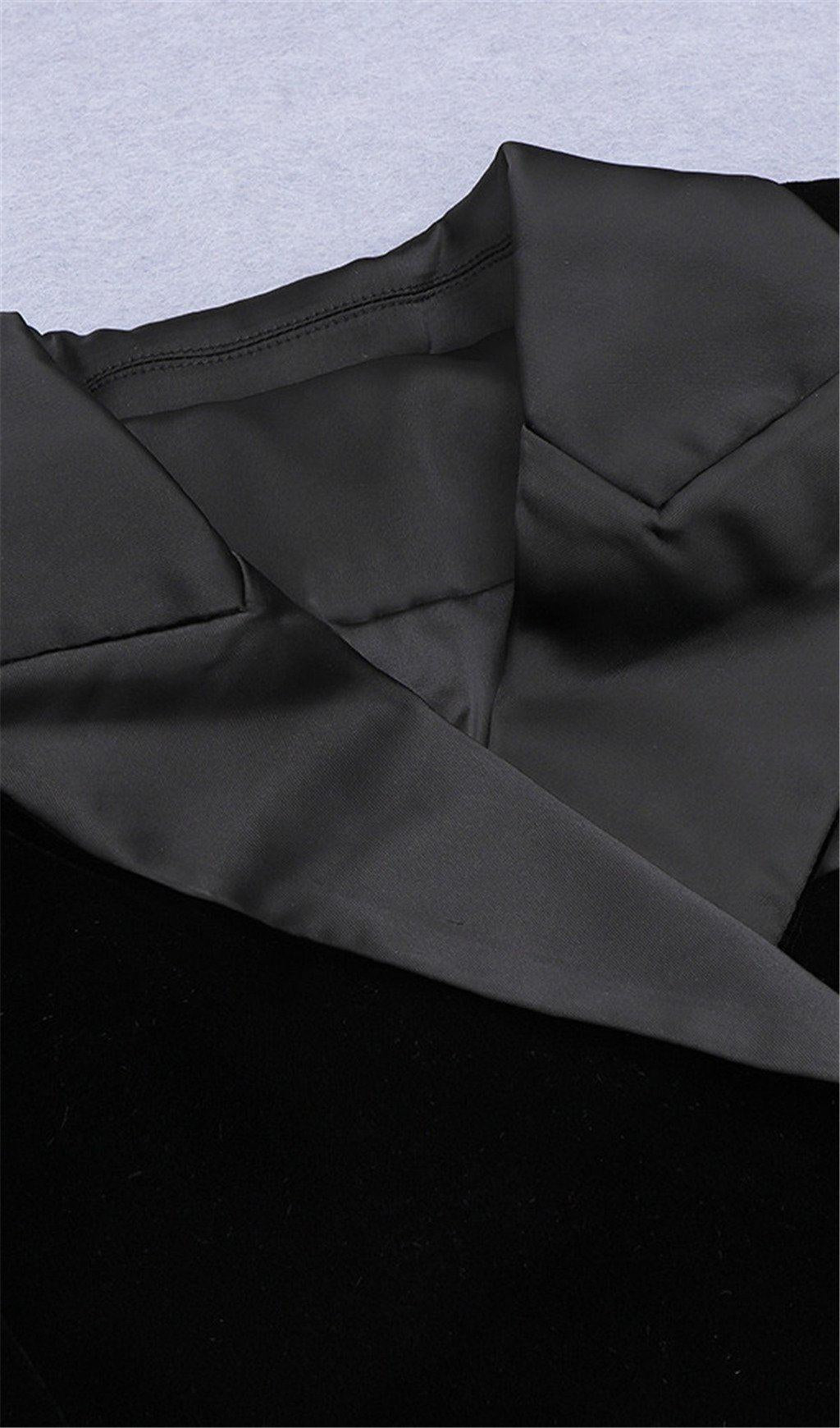 LACE DRAPED TUXEDO DRESS IN BLACK