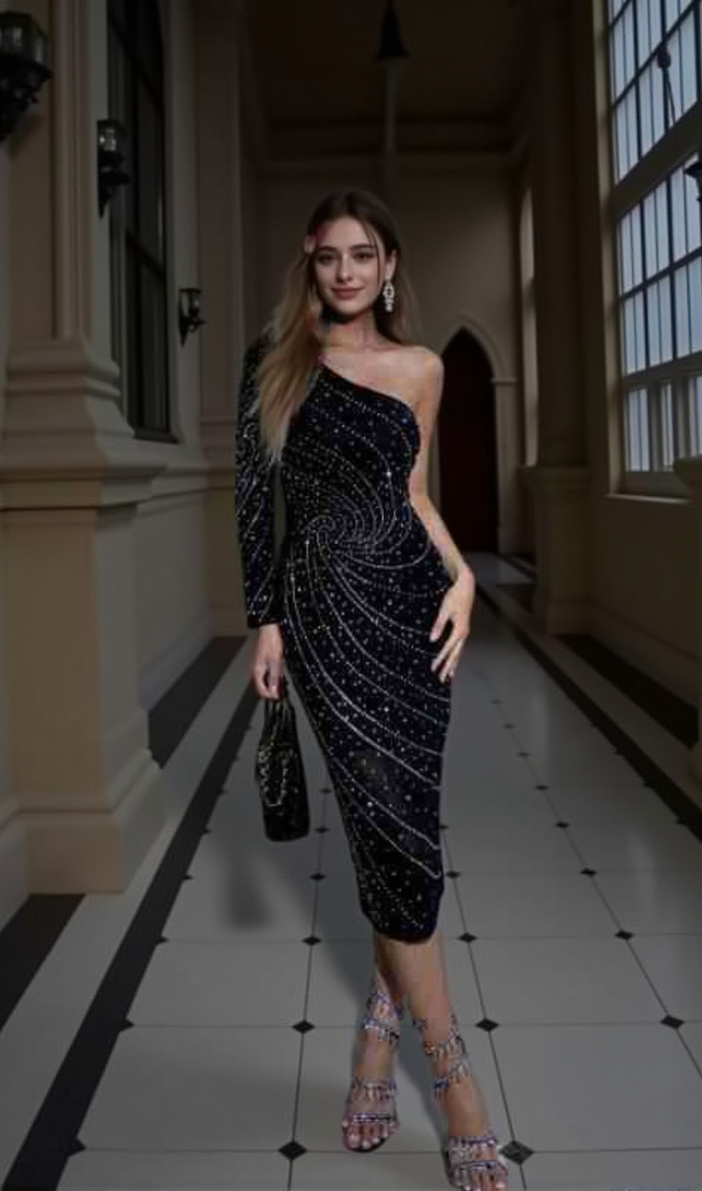 The dress features a one - shoulder design. The long sleeve on one side adds an elegant and distinctive touch. The body - hugging mermaid cut fits the body curves closely, highlighting the wearer's graceful figure. The hemline falls just below the knees, striking a balance between dignity and fashion.