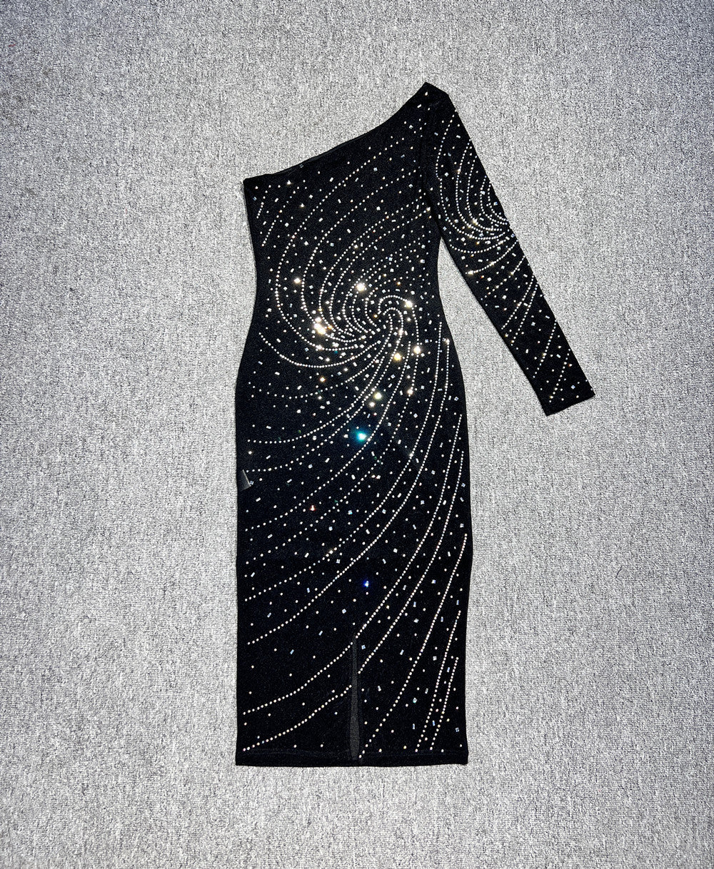 The dress is covered with shiny rhinestones arranged in a spiral pattern. They sparkle brightly under the light, exuding a strong sense of luxury. The combination of the black base fabric and the rhinestones is both classic and eye - catching.
