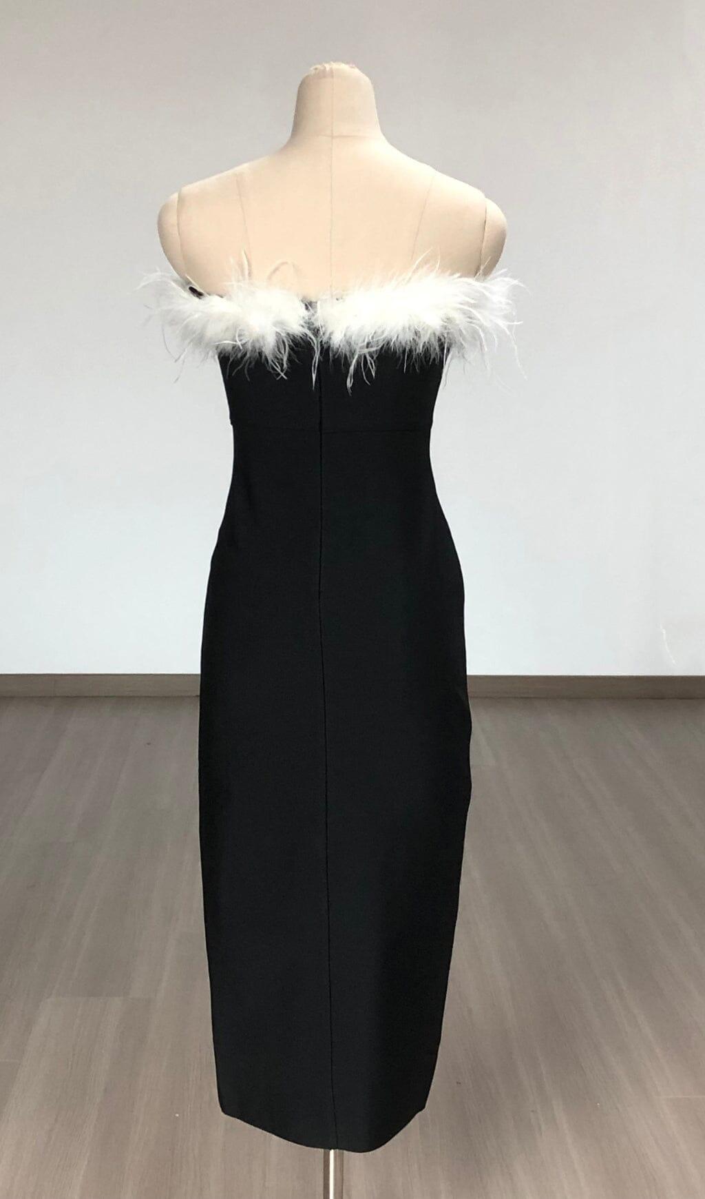 BLACK OFF SHOULDER FEATHERS MAXI BANDAGE DRESS