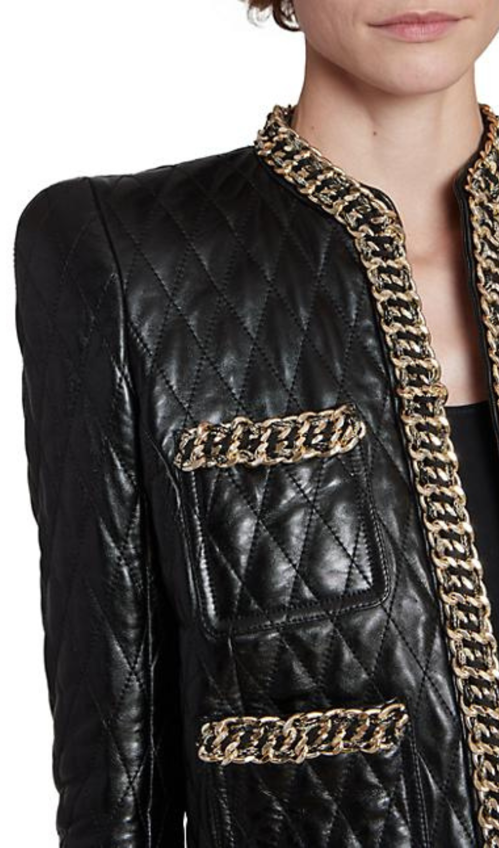 Stay warm and stylish in this black quilted leather chain jacket. Featuring an adjustable chain detail and a soft quilted inner lining, this jacket is perfect for a trendy winter look.