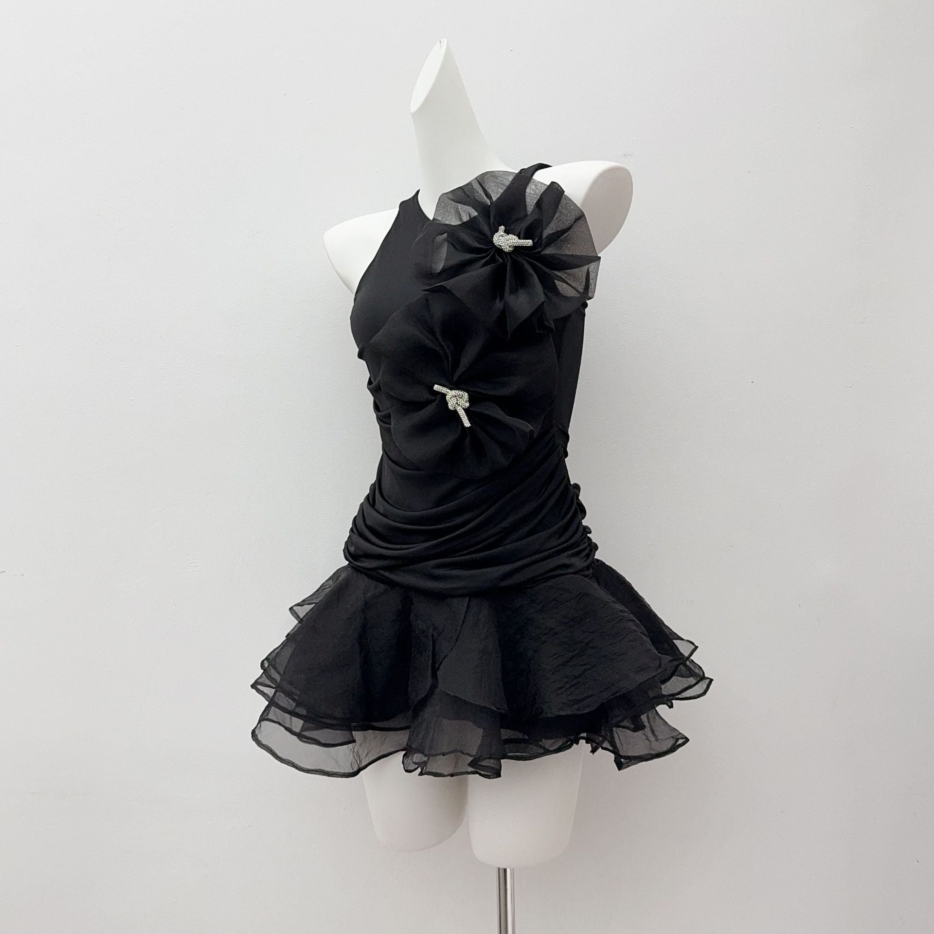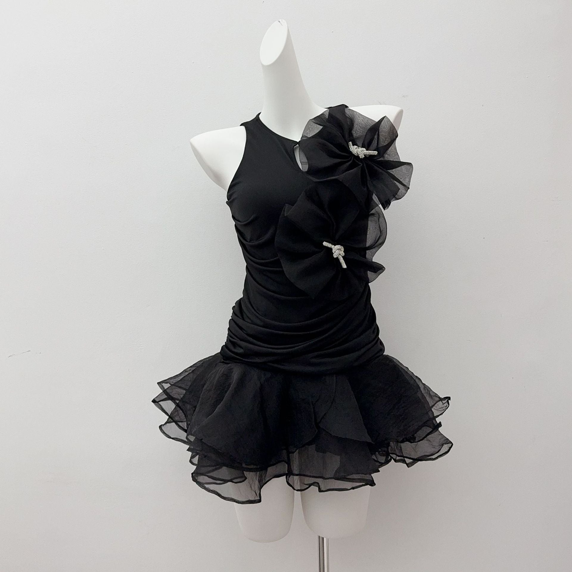 BLACK ROUND NECK SLEEVELESS RUFFLED MINI DRESS