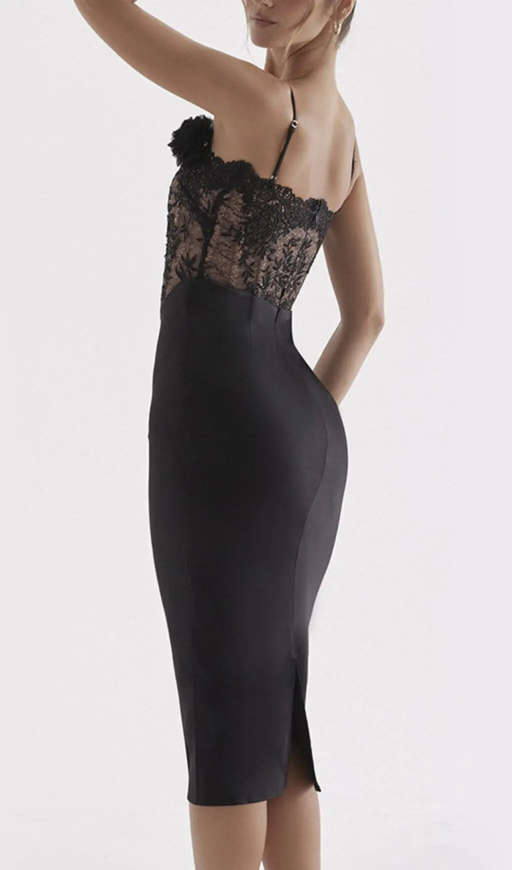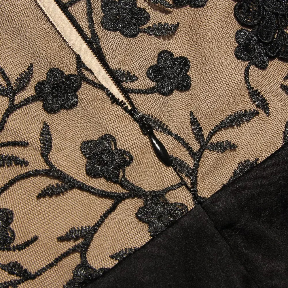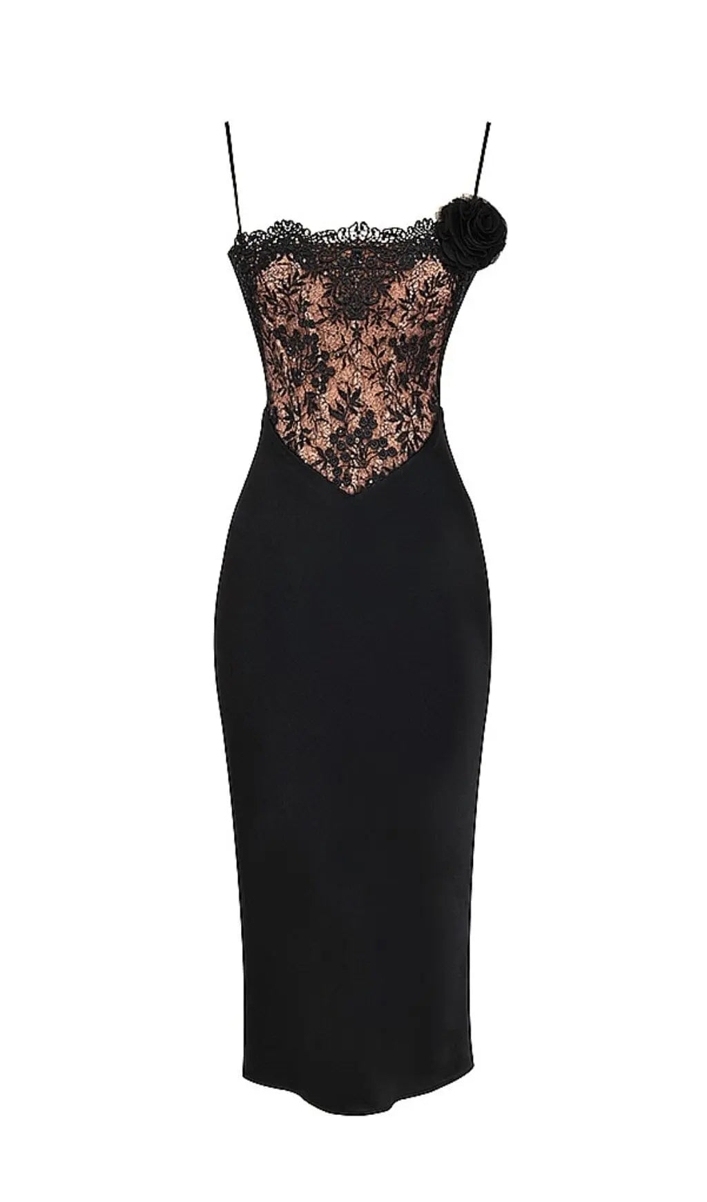 The romantic cut of our corset dress will make you feel super feminine at your next event. The bodice is overlaid with delicate floral lace that's beautifully scalloped at the neckline and backed in our special power mesh for modest coverage. The cinched in fit and corsetry boning accentuates adds structure for a tiny waist. We love the flower embellishment to one shoulder that is detachable to wear with or without depending on your mood.